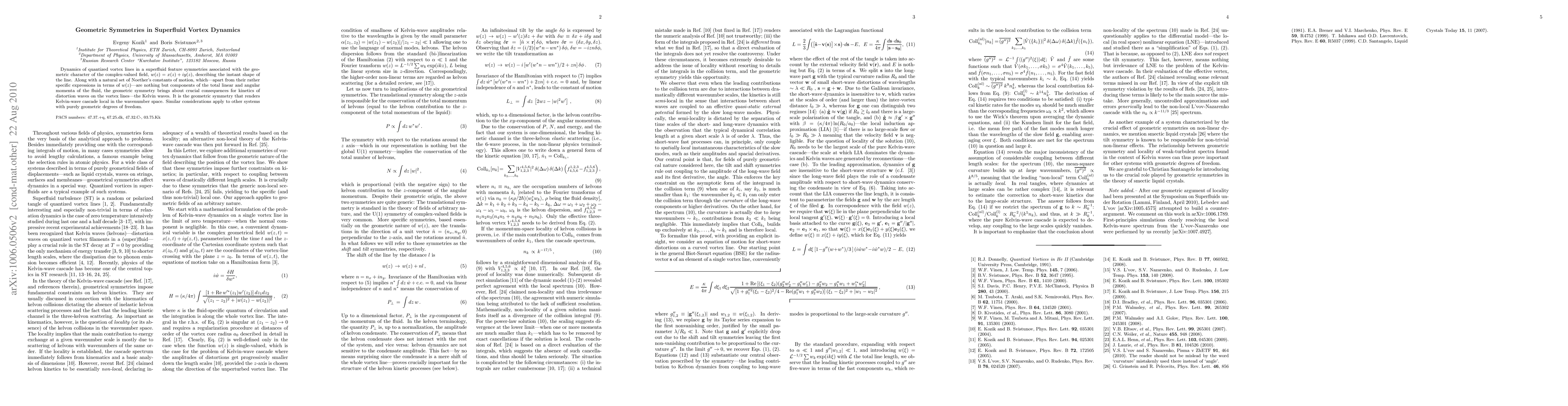 Dynamics of quantized vortex lines in a superfluid feature symmetries associated with the geometric character of the complex-valued field, $w(z)=x(z)+iy(z)$, describing the instant shape of the line. Along with a natural set of Noether's constants of motion, which---apart from their rather specific expressions in terms of $w(z)$---are nothing but components of the total linear and angular momenta of the fluid, the geometric symmetry brings about crucial consequences for kinetics of distortion waves on the vortex lines---the Kelvin waves. It is the geometric symmetry that renders Kelvin-wave cascade local in the wavenumber space. Similar considerations apply to other systems with purely geometric degrees of freedom.