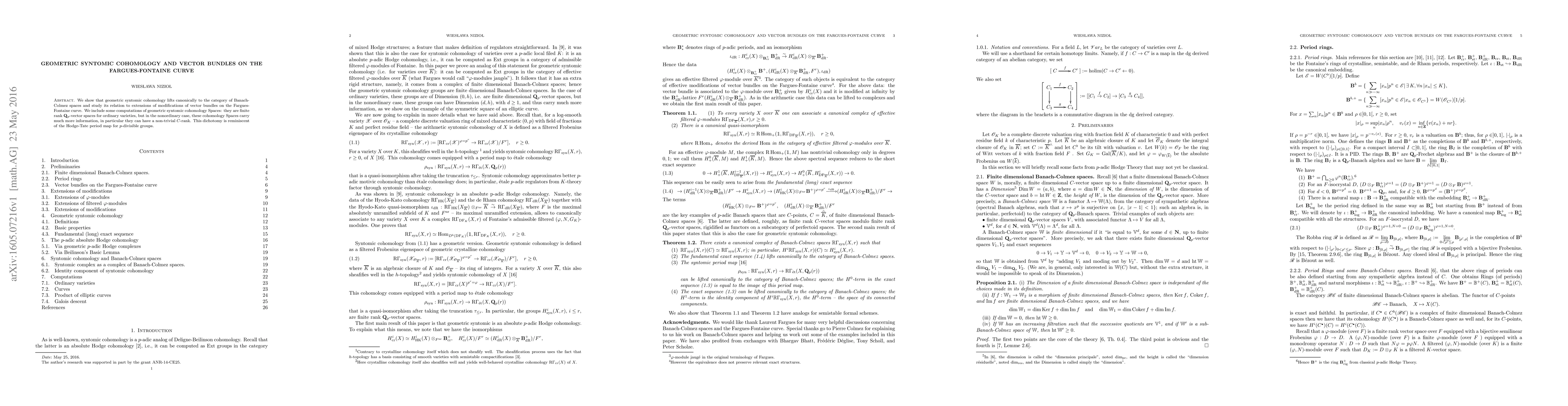 We show that geometric syntomic cohomology lifts canonically to the category of Banach-Colmez spaces and study its relation to extensions of modifications of vector bundles on the Fargues-Fontaine curve. We include some computations of geometric syntomic cohomology Spaces: they are finite rank $Q_p$-vector spaces for ordinary varieties, but in the nonordinary case, these cohomology Spaces carry much more information, in particular they can have a non-trivial $C$-rank. This dichotomy is reminiscent of the Hodge-Tate period map for $p$-divisible groups.