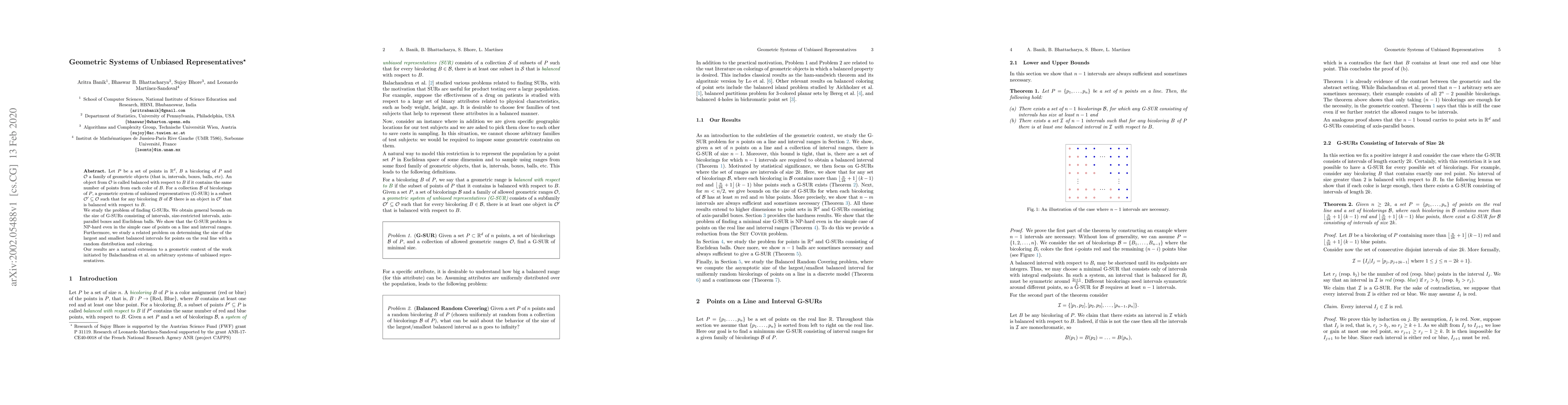This research paper explores Geometric Systems of Unbiased Representatives (G-SURs), which are subsets of geometric objects that maintain equal point distribution across any bicoloring of a point set. The study provides bounds for G-SURs composed of intervals, axis-parallel boxes, and Euclidean balls. It also proves the NP-hardness of the G-SUR problem for points on a line with interval ranges. The work extends previous research on unbiased representatives into a geometric context.