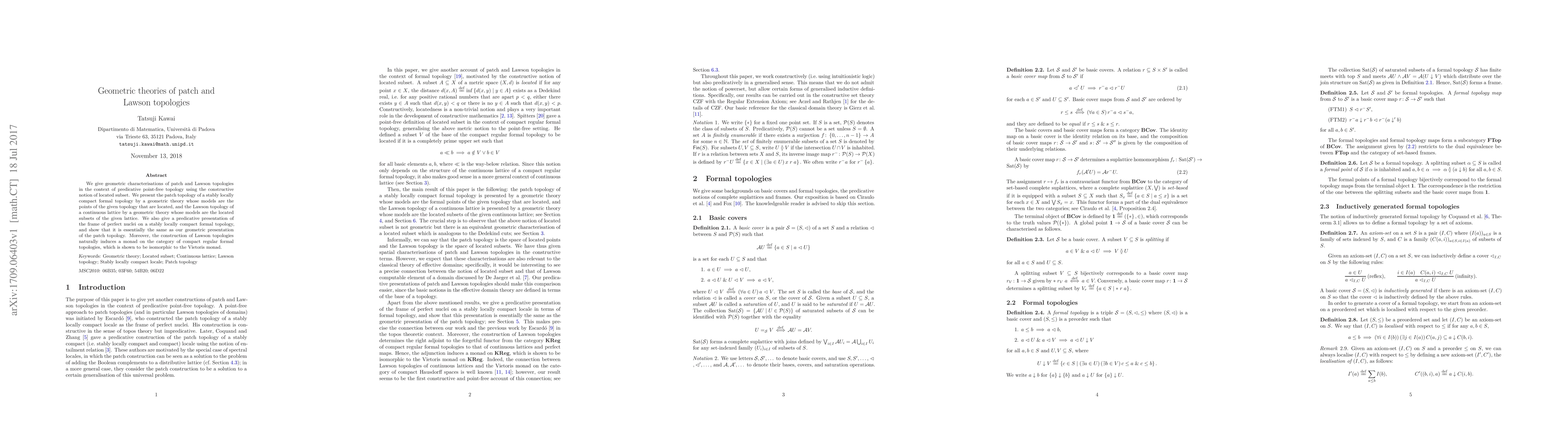 We give geometric characterisations of patch and Lawson topologies in the context of predicative point-free topology using the constructive notion of located subset. We present the patch topology of a stably locally compact formal topology by a geometric theory whose models are the points of the given topology that are located, and the Lawson topology of a continuous lattice by a geometric theory whose models are the located subsets of the given lattice. We also give a predicative presentation of the frame of perfect nuclei on a stably locally compact formal topology, and show that it is essentially the same as our geometric presentation of the patch topology. Moreover, the construction of Lawson topologies naturally induces a monad on the category of compact regular formal topologies, which is shown to be isomorphic to the Vietoris monad.