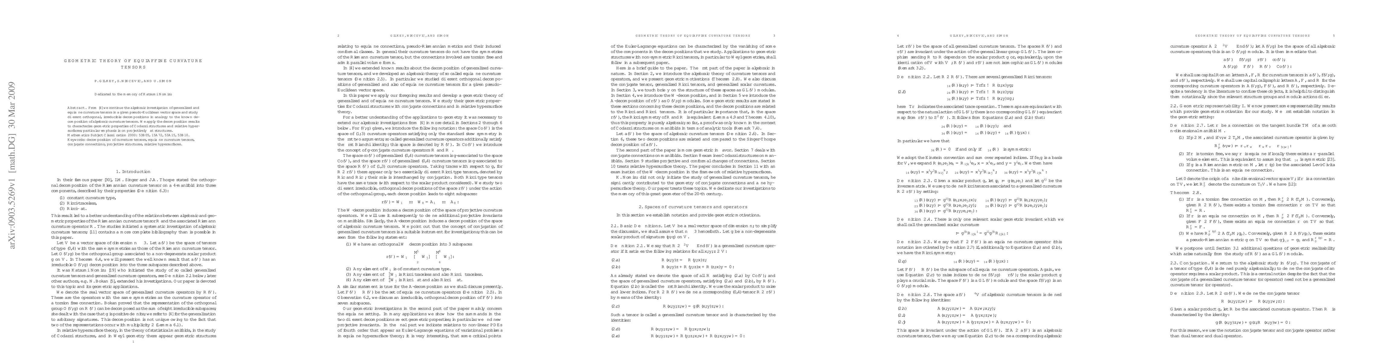 We present an algebraic investigation of generalized and equiaffine curvature tensors in a given pseudo-Euclidean vector space and study different orthogonal, irreducible decompositions in analogy to the known decomposition of algebraic curvature tensors. We apply the decomposition results to characterize geometric properties of Codazzi structures and relative hypersurfaces; particular emphasis is on projectively flat structures.