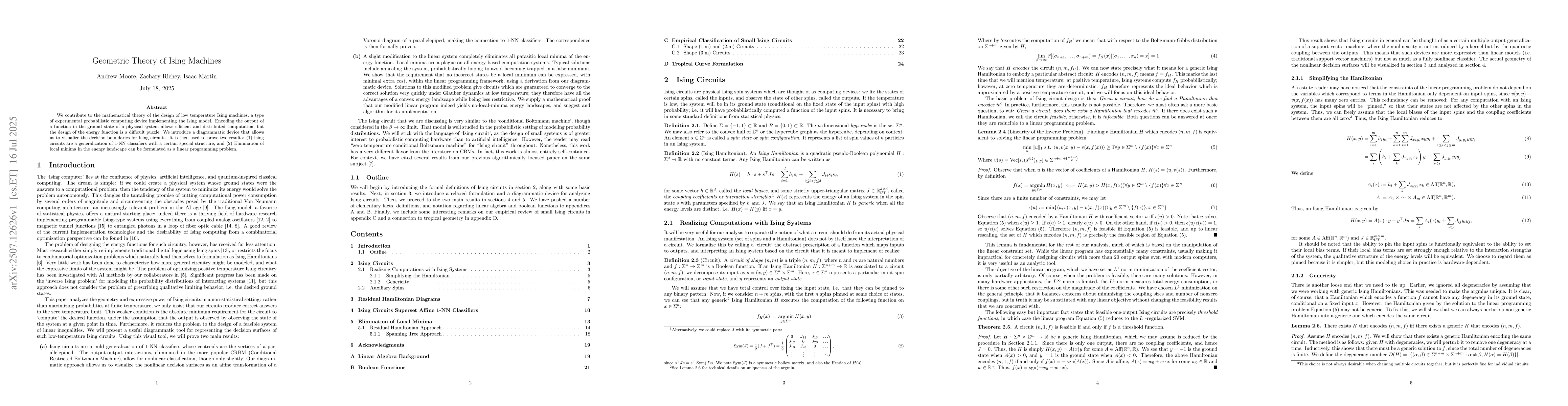 We contribute to the mathematical theory of the design of low temperature Ising machines, a type of experimental probabilistic computing device implementing the Ising model. Encoding the output of a function in the ground state of a physical system allows efficient and distributed computation, but the design of the energy function is a difficult puzzle. We introduce a diagrammatic device that allows us to visualize the decision boundaries for Ising circuits. It is then used to prove two results: (1) Ising circuits are a generalization of 1-NN classifiers with a certain special structure, and (2) Elimination of local minima in the energy landscape can be formulated as a linear programming problem.