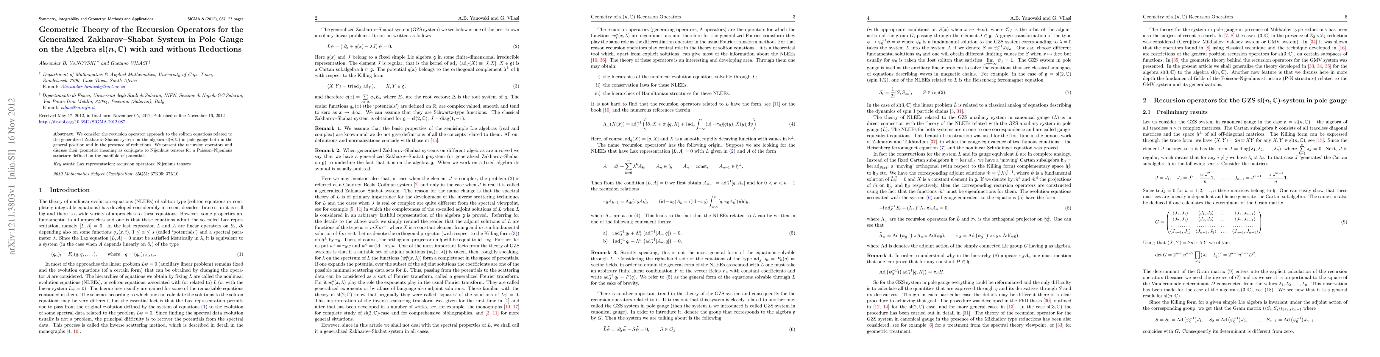 We consider the recursion operator approach to the soliton equations related to the generalized Zakharov-Shabat system on the algebra sl(n,C) in pole gauge both in the general position and in the presence of reductions. We present the recursion operators and discuss their geometric meaning as conjugate to Nijenhuis tensors for a Poisson-Nijenhuis structure defined on the manifold of potentials.