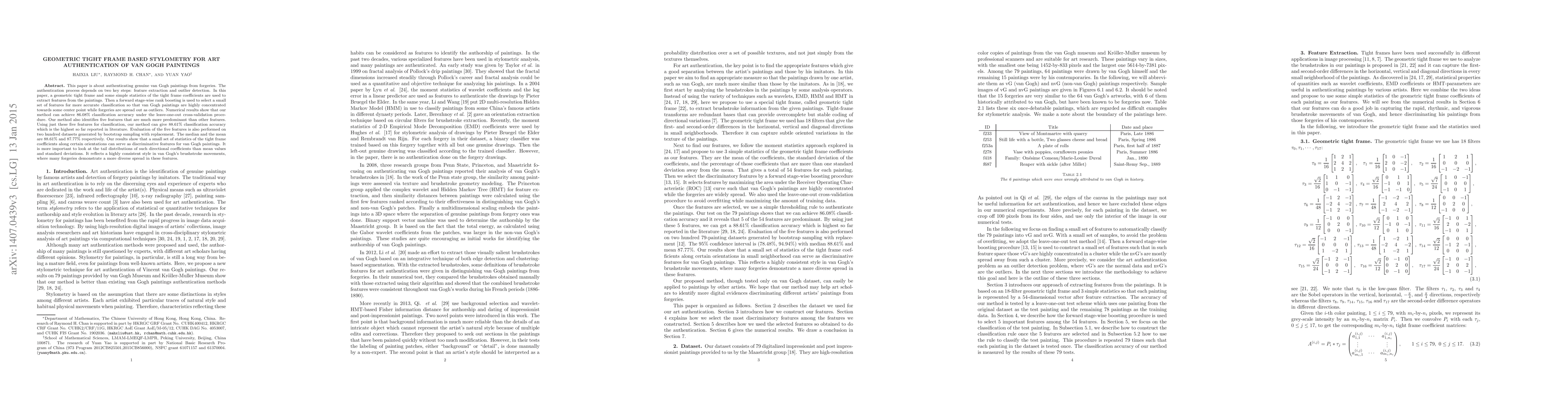 This paper is about authenticating genuine van Gogh paintings from forgeries. The authentication process depends on two key steps: feature extraction and outlier detection. In this paper, a geometric tight frame and some simple statistics of the tight frame coefficients are used to extract features from the paintings. Then a forward stage-wise rank boosting is used to select a small set of features for more accurate classification so that van Gogh paintings are highly concentrated towards some center point while forgeries are spread out as outliers. Numerical results show that our method can achieve 86.08% classification accuracy under the leave-one-out cross-validation procedure. Our method also identifies five features that are much more predominant than other features. Using just these five features for classification, our method can give 88.61% classification accuracy which is the highest so far reported in literature. Evaluation of the five features is also performed on two hundred datasets generated by bootstrap sampling with replacement. The median and the mean are 88.61% and 87.77% respectively. Our results show that a small set of statistics of the tight frame coefficients along certain orientations can serve as discriminative features for van Gogh paintings. It is more important to look at the tail distributions of such directional coefficients than mean values and standard deviations. It reflects a highly consistent style in van Gogh's brushstroke movements, where many forgeries demonstrate a more diverse spread in these features.