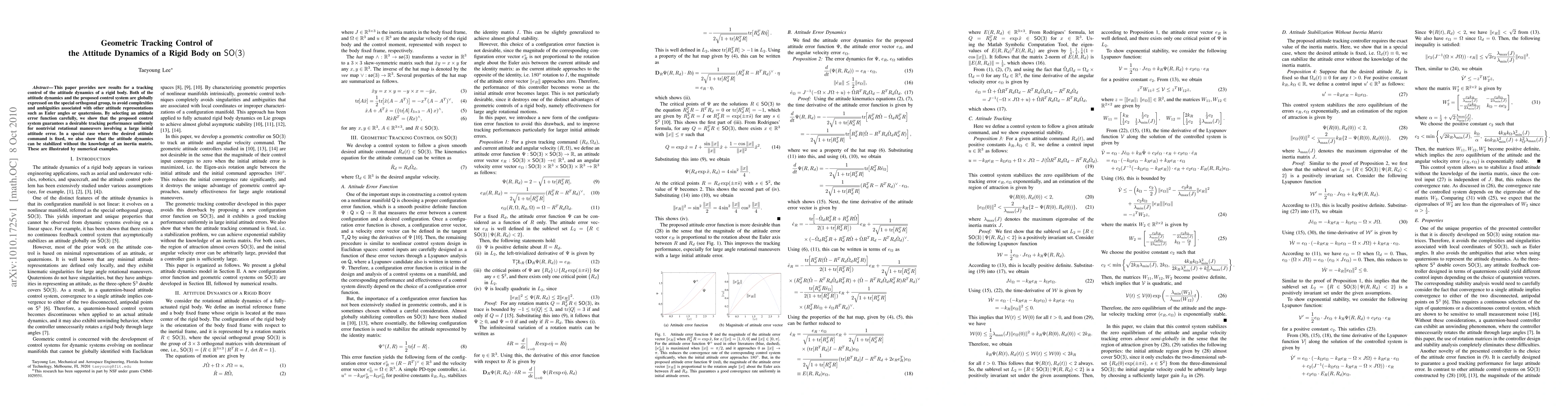 This paper provides new results for a tracking control of the attitude dynamics of a rigid body. Both of the attitude dynamics and the proposed control system are globally expressed on the special orthogonal group, to avoid complexities and ambiguities associated with other attitude representations such as Euler angles or quaternions. By selecting an attitude error function carefully, we show that the proposed control system guarantees a desirable tracking performance uniformly for nontrivial rotational maneuvers involving a large initial attitude error. In a special case where the desired attitude command is fixed, we also show that the attitude dynamics can be stabilized without the knowledge of an inertia matrix. These are illustrated by numerical examples.