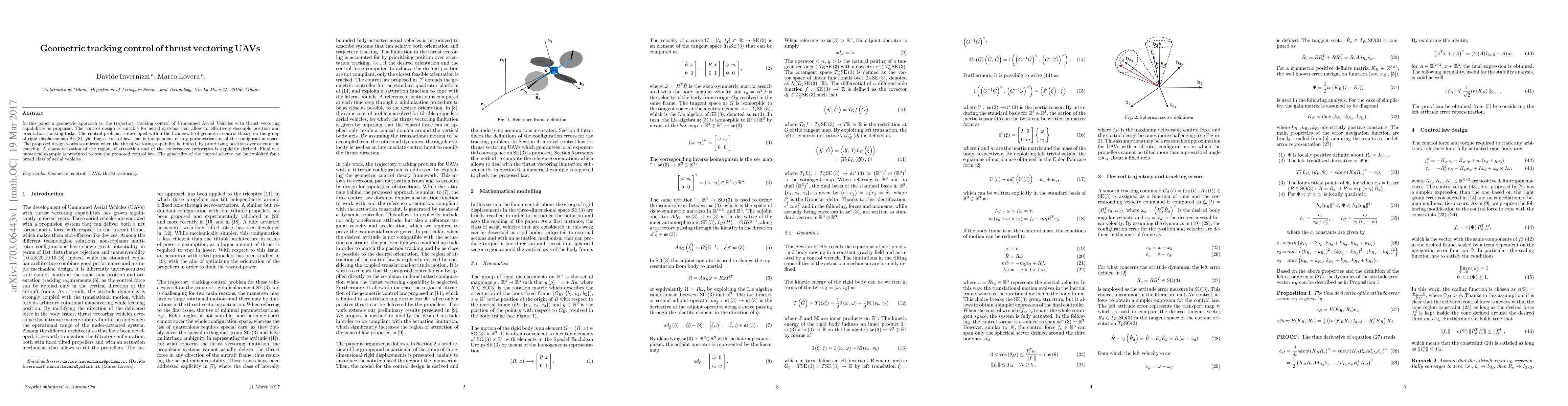 This paper proposes a geometric control approach for trajectory tracking in UAVs with thrust vectoring, ensuring decoupled position and orientation control. The control law is derived from geometric control theory on SE(3), prioritizing position over orientation when thrust vectoring is limited, and includes a characterization of its region of attraction and convergence properties.