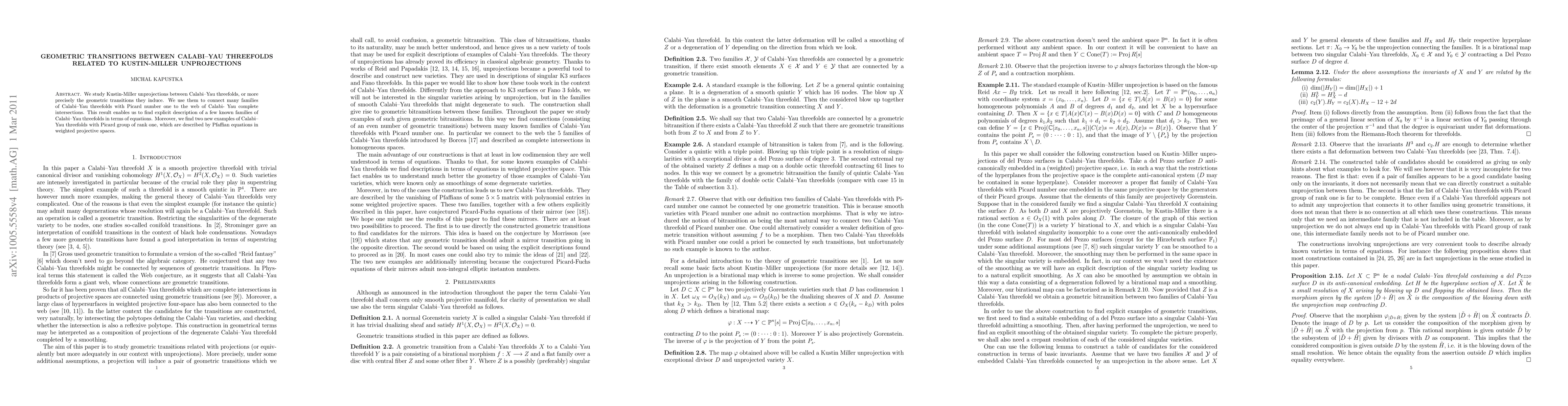 We study Kustin-Miller unprojections between Calabi-Yau threefolds or more precisely the geometric transitions they induce. We use them to connect many families of Calabi-Yau threefolds with Picard number one to the web of Calabi Yau complete intersections. This enables us to find explicit description of a few known families of Calabi-Yau threefolds in terms of equations. Moreover we find two new examples of Calabi-Yau threefolds with Picard group of rank one, described by Pfaffian equations in weighted projective spaces.