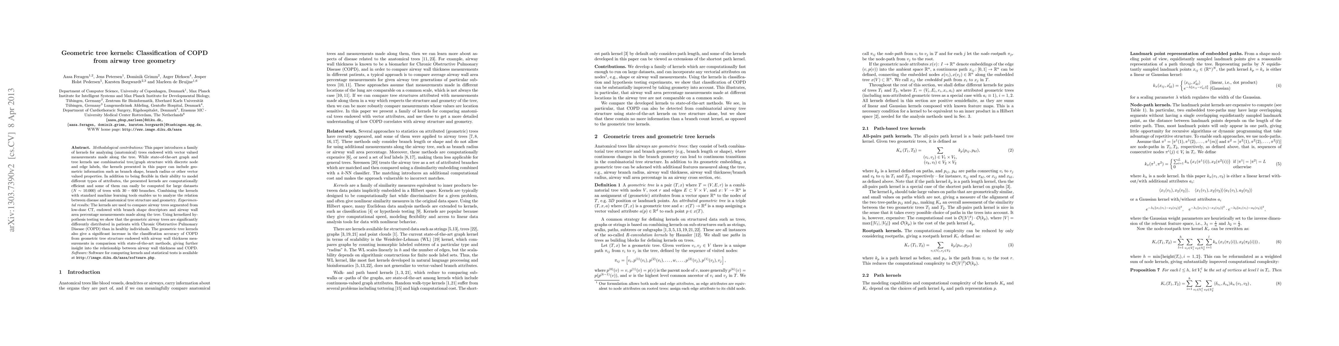 This paper introduces geometric tree kernels that incorporate vector-valued measurements for analyzing anatomical tree structures, demonstrating their efficiency and effectiveness in classifying Chronic Obstructive Pulmonary Disease (COPD) based on airway tree geometry compared to existing methods. The kernels show significant differences in airway tree distributions between COPD patients and healthy individuals, enhancing understanding of the relationship between airway wall thickness and COPD.