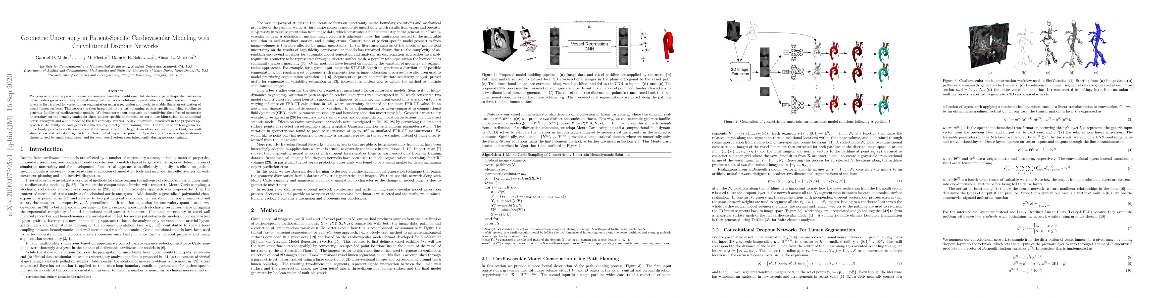 This paper introduces a convolutional neural network with dropout for segmenting vessel lumens and generating patient-specific cardiovascular models, demonstrating that geometric uncertainty significantly impacts wall shear stress and velocity magnitude but has a limited effect on pressure, especially in small vessels and infrequent lesions.