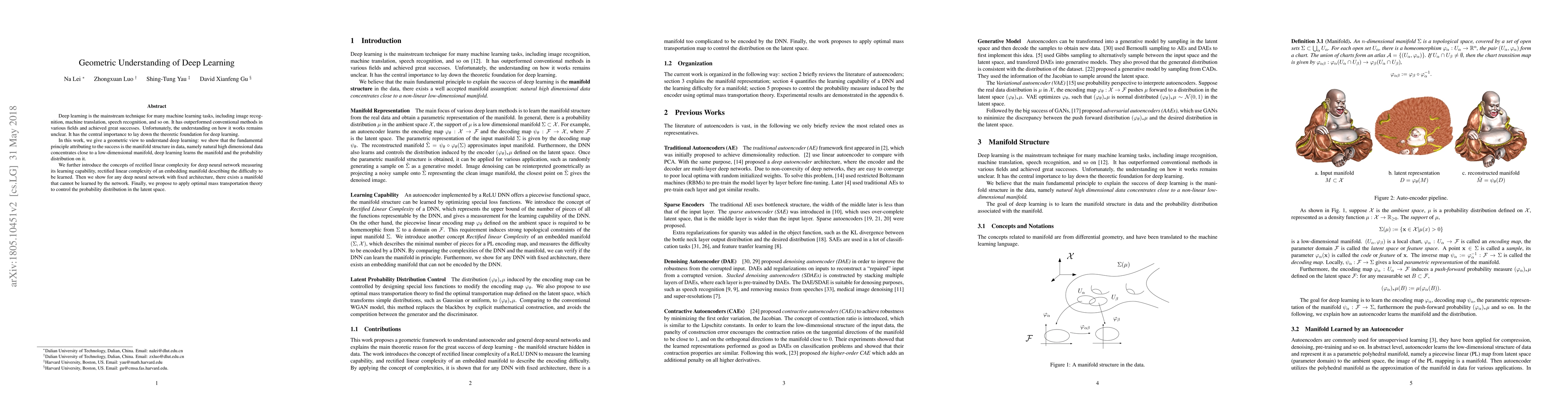 This research proposes a geometric perspective to understand deep learning, suggesting its success is rooted in recognizing the manifold structure in high-dimensional data. It introduces rectified linear complexity for networks and manifolds, proving the existence of unlearnable manifolds for fixed architectures. The paper also suggests using optimal mass transportation theory to manage probability distributions in latent spaces.