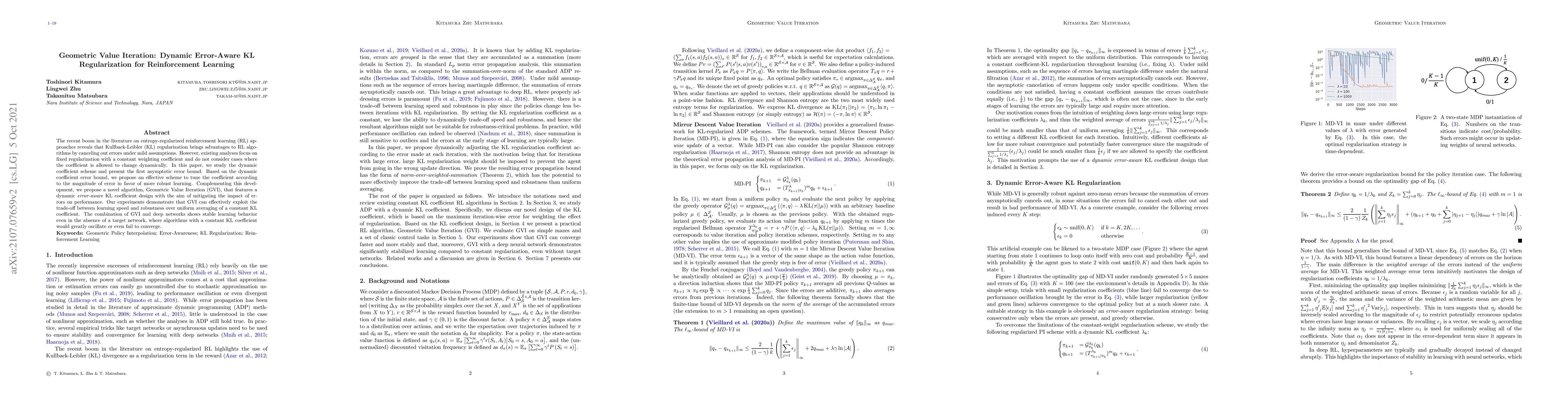 The recent boom in the literature on entropy-regularized reinforcement learning (RL) approaches reveals that Kullback-Leibler (KL) regularization brings advantages to RL algorithms by canceling out errors under mild assumptions. However, existing analyses focus on fixed regularization with a constant weighting coefficient and do not consider cases where the coefficient is allowed to change dynamically. In this paper, we study the dynamic coefficient scheme and present the first asymptotic error bound. Based on the dynamic coefficient error bound, we propose an effective scheme to tune the coefficient according to the magnitude of error in favor of more robust learning. Complementing this development, we propose a novel algorithm, Geometric Value Iteration (GVI), that features a dynamic error-aware KL coefficient design with the aim of mitigating the impact of errors on performance. Our experiments demonstrate that GVI can effectively exploit the trade-off between learning speed and robustness over uniform averaging of a constant KL coefficient. The combination of GVI and deep networks shows stable learning behavior even in the absence of a target network, where algorithms with a constant KL coefficient would greatly oscillate or even fail to converge.