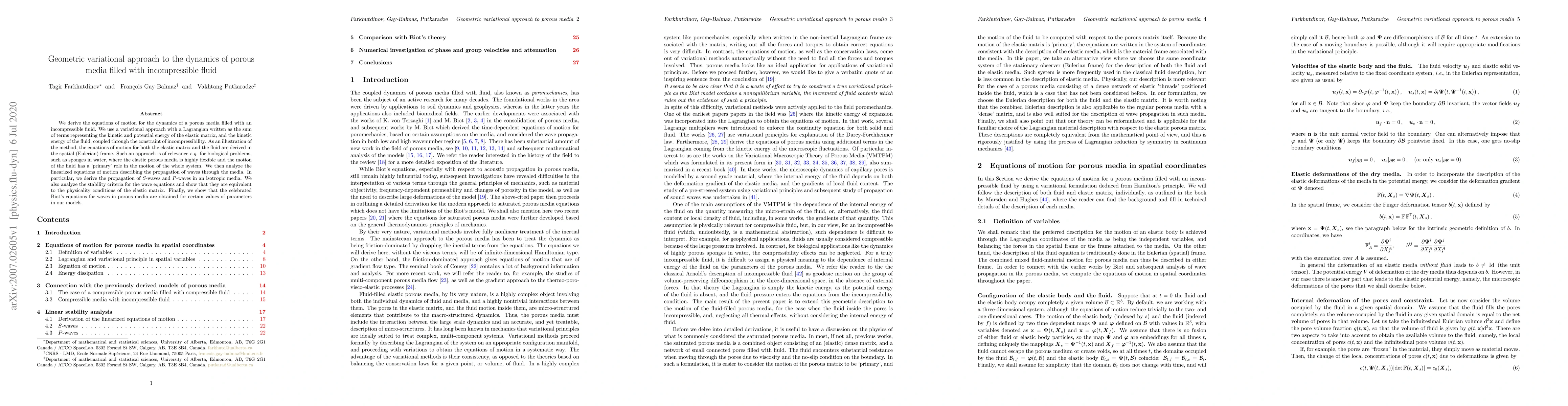 This paper derives the equations of motion for a porous medium filled with incompressible fluid using a geometric variational approach, focusing on the dynamics in the spatial frame. It analyzes the propagation of S-waves and P-waves, establishes stability criteria, and demonstrates the equivalence to Biot's equations under specific conditions.