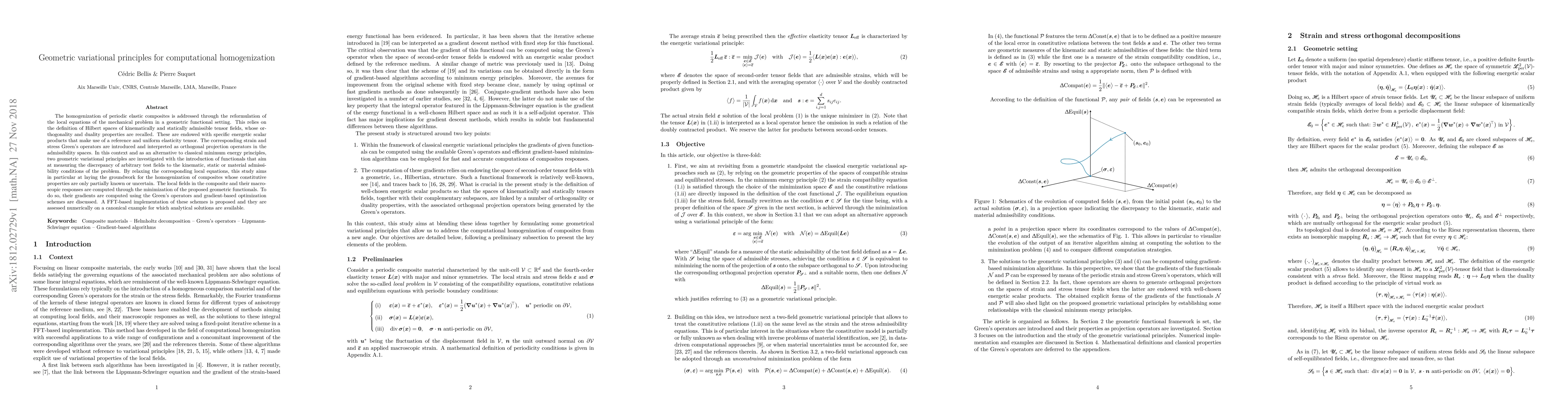 The homogenization of periodic elastic composites is addressed through the reformulation of the local equations of the mechanical problem in a geometric functional setting. This relies on the definition of Hilbert spaces of kinematically and statically admissible tensor fields, whose orthogonality and duality properties are recalled. These are endowed with specific energetic scalar products that make use of a reference and uniform elasticity tensor. The corresponding strain and stress Green's operators are introduced and interpreted as orthogonal projection operators in the admissibility spaces. In this context and as an alternative to classical minimum energy principles, two geometric variational principles are investigated with the introduction of functionals that aim at measuring the discrepancy of arbitrary test fields to the kinematic, static or material admissibility conditions of the problem. By relaxing the corresponding local equations, this study aims in particular at laying the groundwork for the homogenization of composites whose constitutive properties are only partially known or uncertain. The local fields in the composite and their macroscopic responses are computed through the minimization of the proposed geometric functionals. To do so, their gradients are computed using the Green's operators and gradient-based optimization schemes are discussed. A FFT-based implementation of these schemes is proposed and they are assessed numerically on a canonical example for which analytical solutions are available.