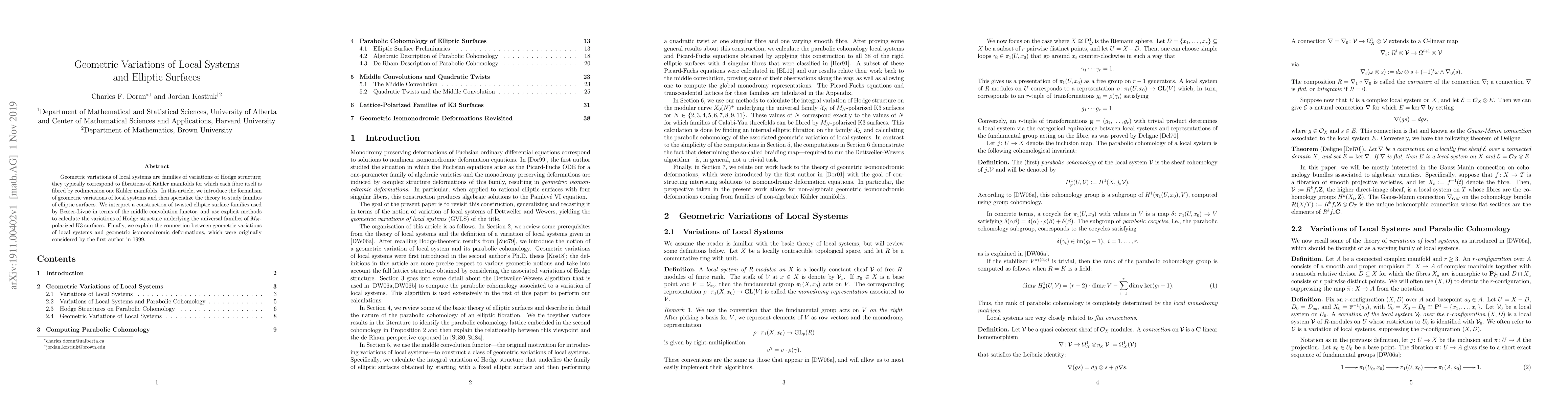 Geometric variations of local systems are families of variations of Hodge structure; they typically correspond to fibrations of K\"{a}hler manifolds for which each fibre itself is fibred by codimension one K\"{a}hler manifolds. In this article, we introduce the formalism of geometric variations of local systems and then specialize the theory to study families of elliptic surfaces. We interpret a construction of twisted elliptic surface families used by Besser-Livn\'{e} in terms of the middle convolution functor, and use explicit methods to calculate the variations of Hodge structure underlying the universal families of $M_N$-polarized K3 surfaces. Finally, we explain the connection between geometric variations of local systems and geometric isomonodromic deformations, which were originally considered by the first author in 1999.
