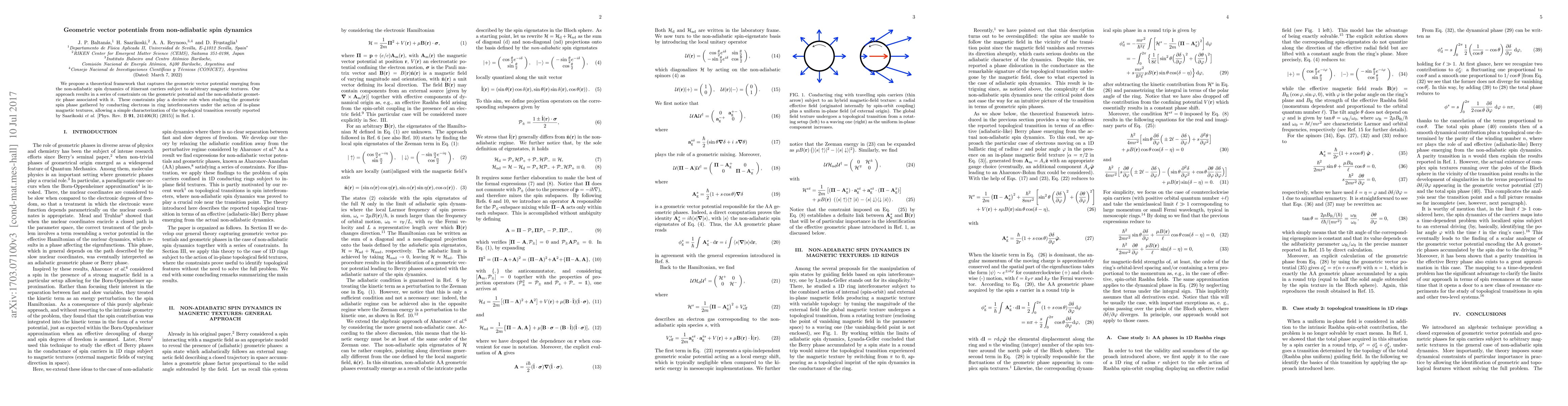 We propose a theoretical framework that captures the geometric vector potential emerging from the non-adiabatic spin dynamics of itinerant carriers subject to arbitrary magnetic textures. Our approach results in a series of constraints on the geometric potential and the non-adiabatic geometric phase associated with it. These constraints play a decisive role when studying the geometric spin phase gathered by conducting electrons in ring interferometers under the action of in-plane magnetic textures, allowing a simple characterization of the topological transition recently reported by Saarikoski et al. [Phys. Rev. B 91, 241406(R) (2015)] in Ref. 1.