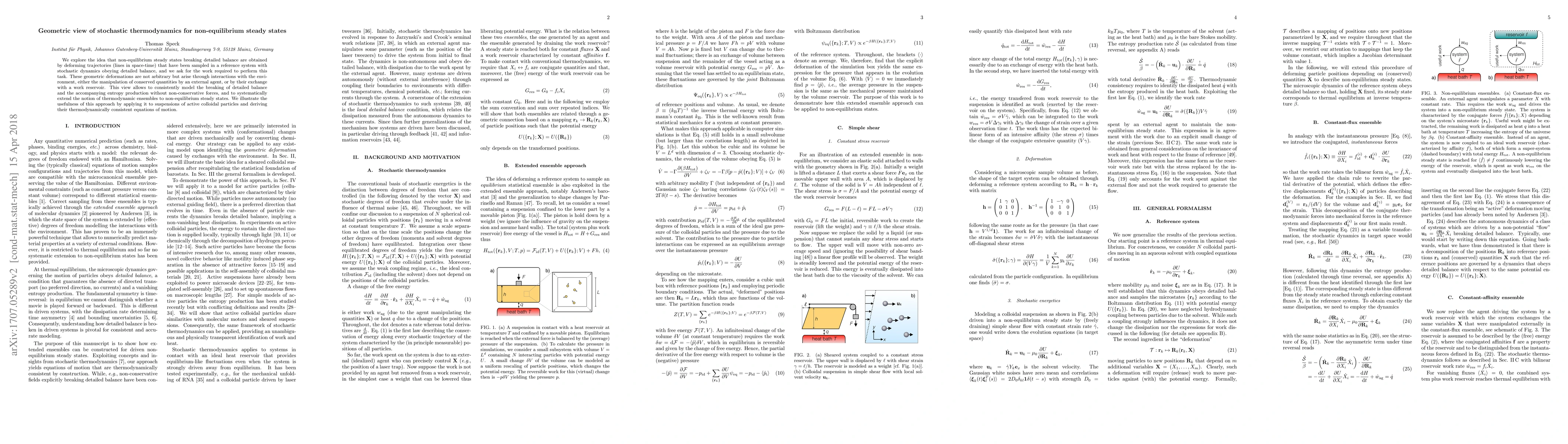 We explore the idea that non-equilibrium steady states breaking detailed balance are obtained by deforming trajectories (lines in space-time) that have been sampled in a reference system with stochastic dynamics obeying detailed balance, and we ask for the work required to perform this task. These geometric deformations are not arbitrary but arise through interactions with the environment, either the manipulation of conserved quantities by an external agent, or by their exchange with a work reservoir. This view allows to consistently model the breaking of detailed balance and the accompanying entropy production without non-conservative forces, and to systematically extend the notion of thermodynamic ensembles to non-equilibrium steady states. We illustrate the usefulness of this approach by applying it to suspensions of active colloidal particles and deriving their thermodynamically consistent equations of motion.