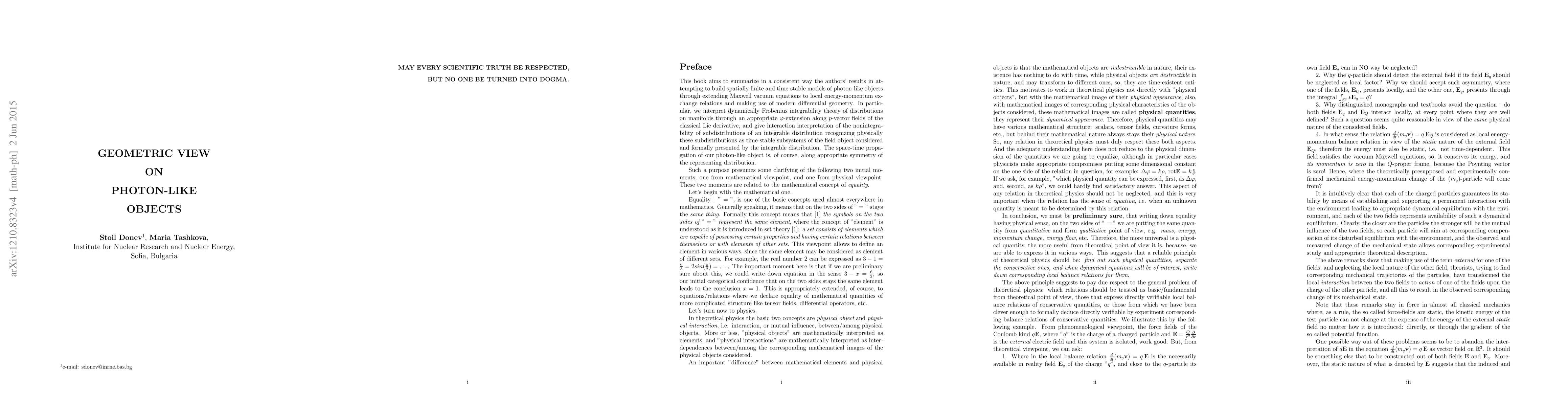 This book aims to summarize in a consistent way the authors' results in attempting to build spatially finite and time-stable models of photon-like objects through extending Maxwell vacuum equations to local energy-momentum exchange relations and making use of modern differential geometry. In particular, we interpret dynamically Frobenius integrability theory of distributions on manifolds through an appropriate $\varphi$-extension along $p$-vector fields of the classical Lie derivative, and give interaction interpretation of the nonintegrability of subdistributions of an integrable distribution recognizing physically these subdistributions as time-stable subsystems of the field object considered and formally presented by the integrable distribution. The space-time propagation of our photon-like object is, of course, along appropriate symmetry of the representing distribution.