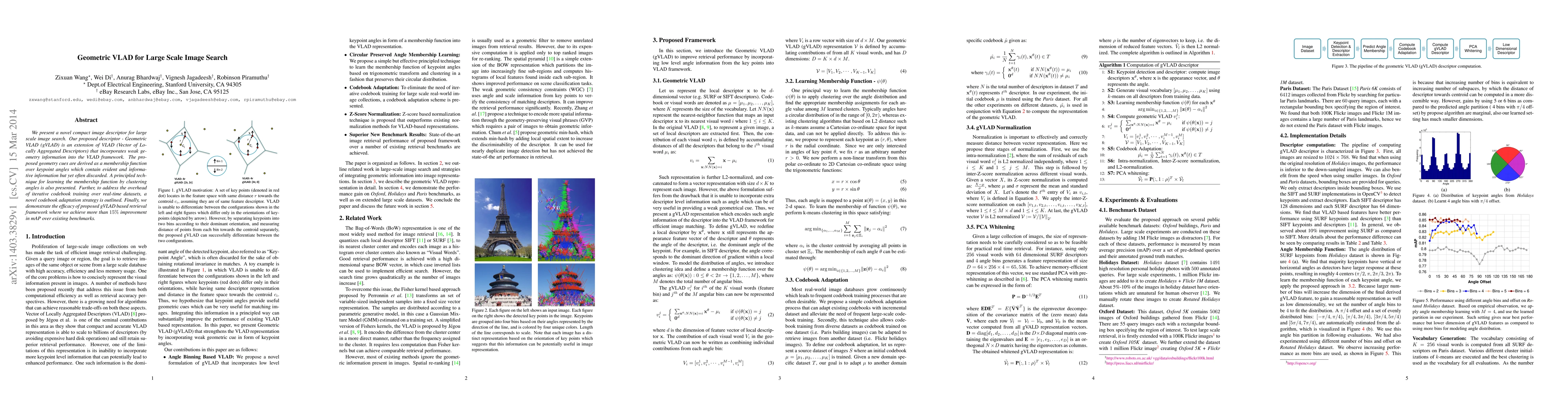 We present a novel compact image descriptor for large scale image search. Our proposed descriptor - Geometric VLAD (gVLAD) is an extension of VLAD (Vector of Locally Aggregated Descriptors) that incorporates weak geometry information into the VLAD framework. The proposed geometry cues are derived as a membership function over keypoint angles which contain evident and informative information but yet often discarded. A principled technique for learning the membership function by clustering angles is also presented. Further, to address the overhead of iterative codebook training over real-time datasets, a novel codebook adaptation strategy is outlined. Finally, we demonstrate the efficacy of proposed gVLAD based retrieval framework where we achieve more than 15% improvement in mAP over existing benchmarks.