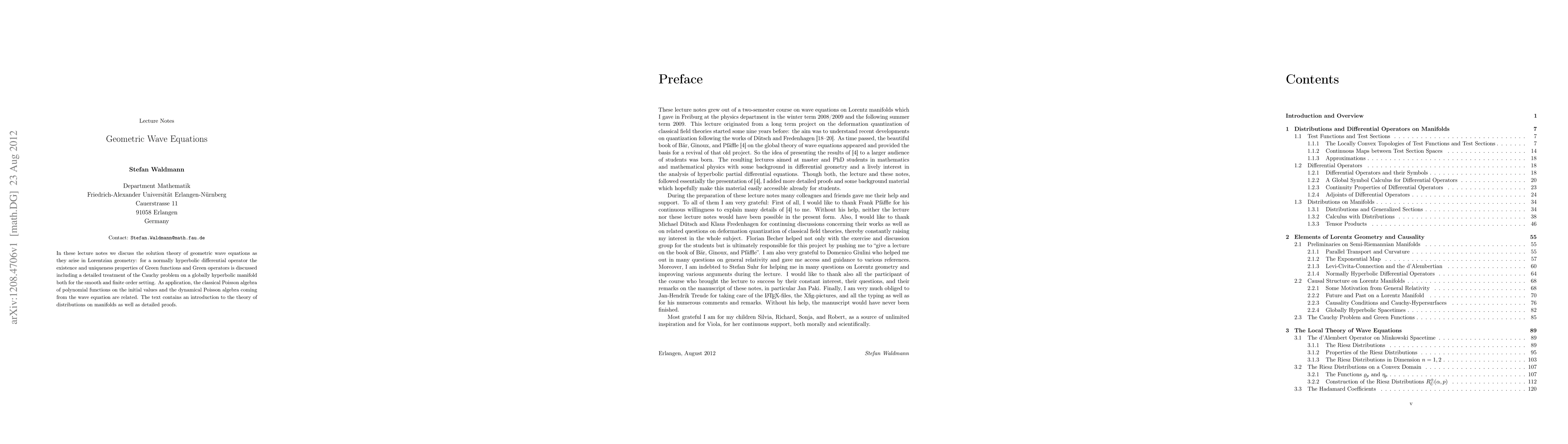 In these lecture notes we discuss the solution theory of geometric wave equations as they arise in Lorentzian geometry: for a normally hyperbolic differential operator the existence and uniqueness properties of Green functions and Green operators is discussed including a detailed treatment of the Cauchy problem on a globally hyperbolic manifold both for the smooth and finite order setting. As application, the classical Poisson algebra of polynomial functions on the initial values and the dynamical Poisson algebra coming from the wave equation are related. The text contains an introduction to the theory of distributions on manifolds as well as detailed proofs.