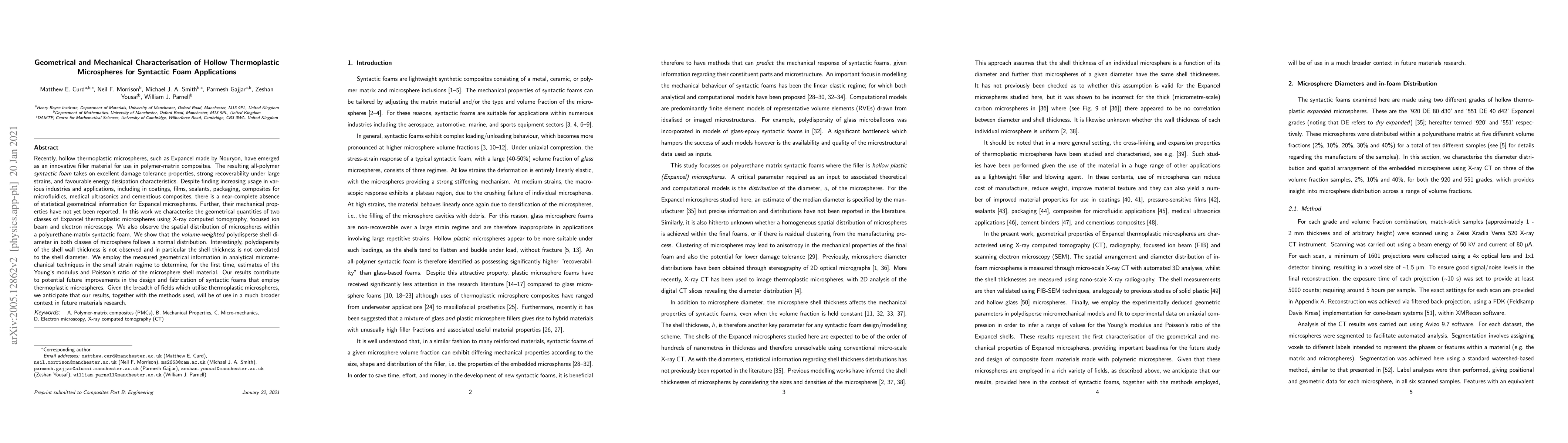 This paper characterises the geometrical and mechanical properties of hollow thermoplastic microspheres used in syntactic foams, revealing normal distribution in shell diameter and providing first-time estimates for the Young's modulus and Poisson's ratio of the microsphere shell material, which could enhance the design and application of these materials.