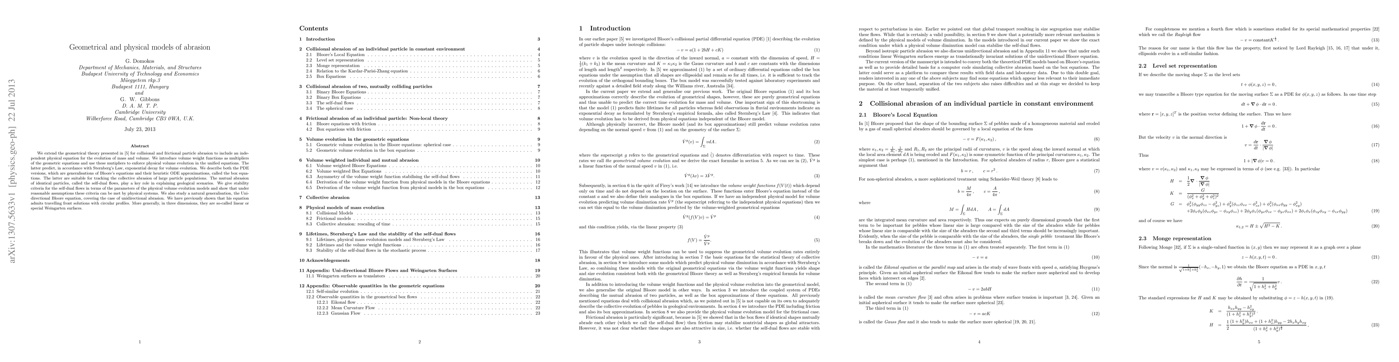 We extend the geometrical theory presented in [5] for collisional and frictional particle abrasion to include an independent physical equation for the evolution of mass and volume. We introduce volume weight functions as multipliers of the geometric equations and use these mutipliers to enforce physical volume evolution in the unified equations. The latter predict, in accordance with Sternberg's Law, exponential decay for volume evolution. We describe both the PDE versions, which are generalisations of Bloore's equations and their heuristic ODE approximations, called the box equations. The latter are suitable for tracking the collective abrasion of large particle populations. The mutual abrasion of identical particles, called the self-dual ows, play a key role in explaining geological scenarios. We give stability criteria for the self-dual ows in terms of the parameters of the physical volume evolution models and show that under reasonable assumptions these criteria can be met by physical systems. We also study a natural generalisation, the unidirectional Bloore equation, covering the case of unidirectional abrasion. We have previously shown that his equation admits travelling front solutions with circular profiles. More generally, in three dimensions, they are so-called linear or special Weingarten surfaces.