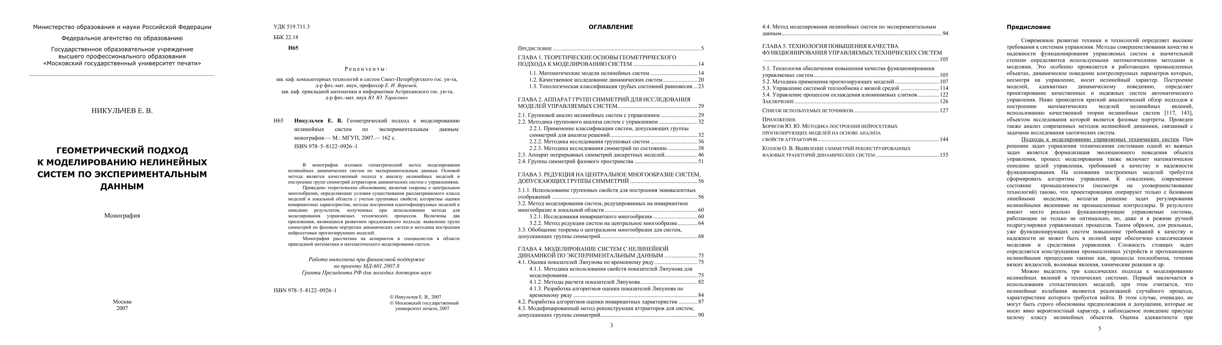 This monograph presents a geometric modeling method nonlinear dynamical systems from experimental data . basis method is a qualitative approach to the analysis of linear models and construction of the symmetry groups of attractors of dynamical systems with controls . A theoretical study including the central theorem manifold defining conditions of existence of the class in question models in the local area , taking into account the group properties , estimation algorithms invariant characteristics , methods of constructing models and identifiable description of the results obtained using the method for simulation -driven engineering processes . included two application is the development of the proposed approach : identification of groups symmetries on the phase portraits of dynamical systems and the method of constructing neural network predictive models