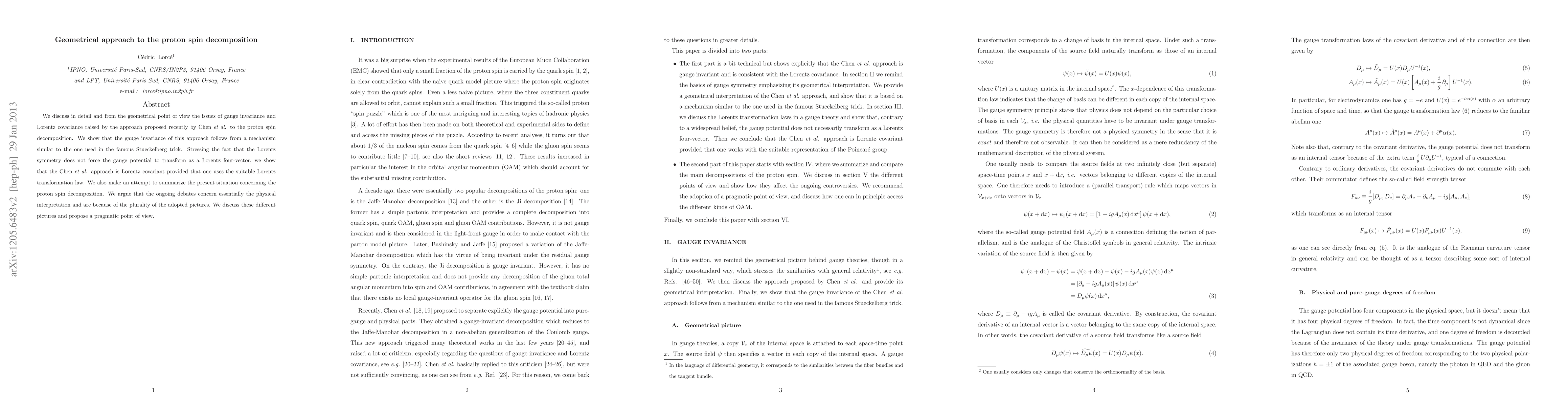We discuss in detail and from the geometrical point of view the issues of gauge invariance and Lorentz covariance raised by the approach proposed recently by Chen et al. to the proton spin decomposition. We show that the gauge invariance of this approach follows from a mechanism similar to the one used in the famous Stueckelberg trick. Stressing the fact that the Lorentz symmetry does not force the gauge potential to transform as a Lorentz four-vector, we show that the Chen et al. approach is Lorentz covariant provided that one uses the suitable Lorentz transformation law. We also make an attempt to summarize the present situation concerning the proton spin decomposition. We argue that the ongoing debates concern essentially the physical interpretation and are due to the plurality of the adopted pictures. We discuss these different pictures and propose a pragmatic point of view.