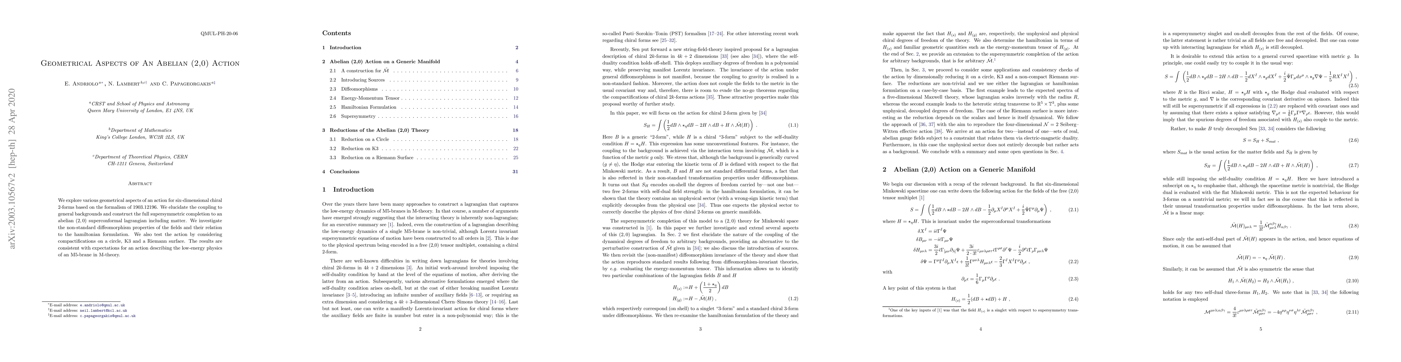 We explore various geometrical aspects of an action for six-dimensional chiral 2-forms based on the formalism of 1903.12196. We elucidate the coupling to general backgrounds and construct the full supersymmetric completion to an abelian (2,0) superconformal lagrangian including matter. We investigate the non-standard diffeomorphism properties of the fields and their relation to the hamiltonian formulation. We also test the action by considering compactifications on a circle, K3 and a Riemann surface. The results are consistent with expectations for an action describing the low-energy physics of an M5-brane in M-theory.
