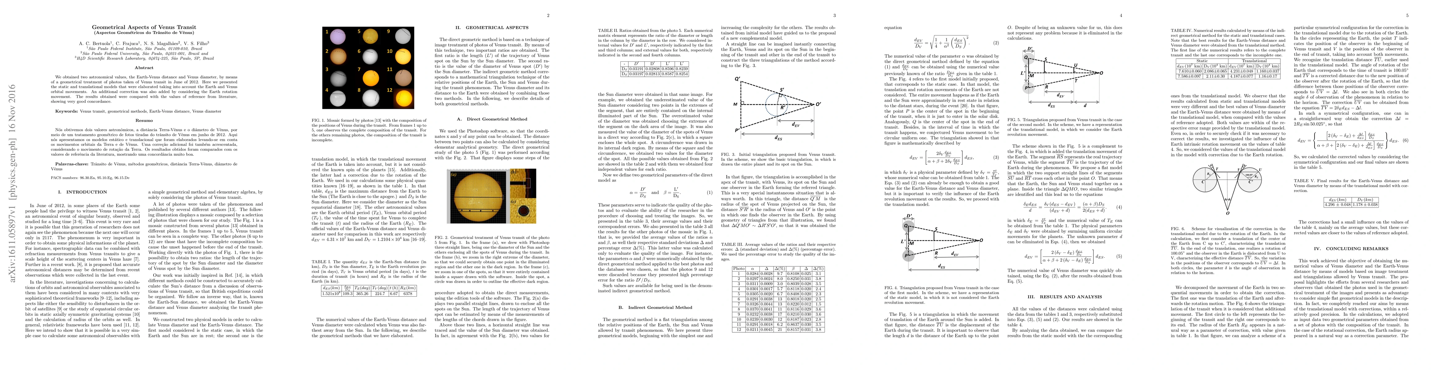 We obtained two astronomical values, the Earth-Venus distance and Venus diameter, by means of a geometrical treatment of photos taken of Venus transit in June of 2012. Here we presented the static and translational modelsthat were elaborated taking into account the Earth and Venus orbital movements. An additional correction was also added by considering the Earth rotation movement. The results obtained were compared with the values of reference from literature, showing very good concordance.