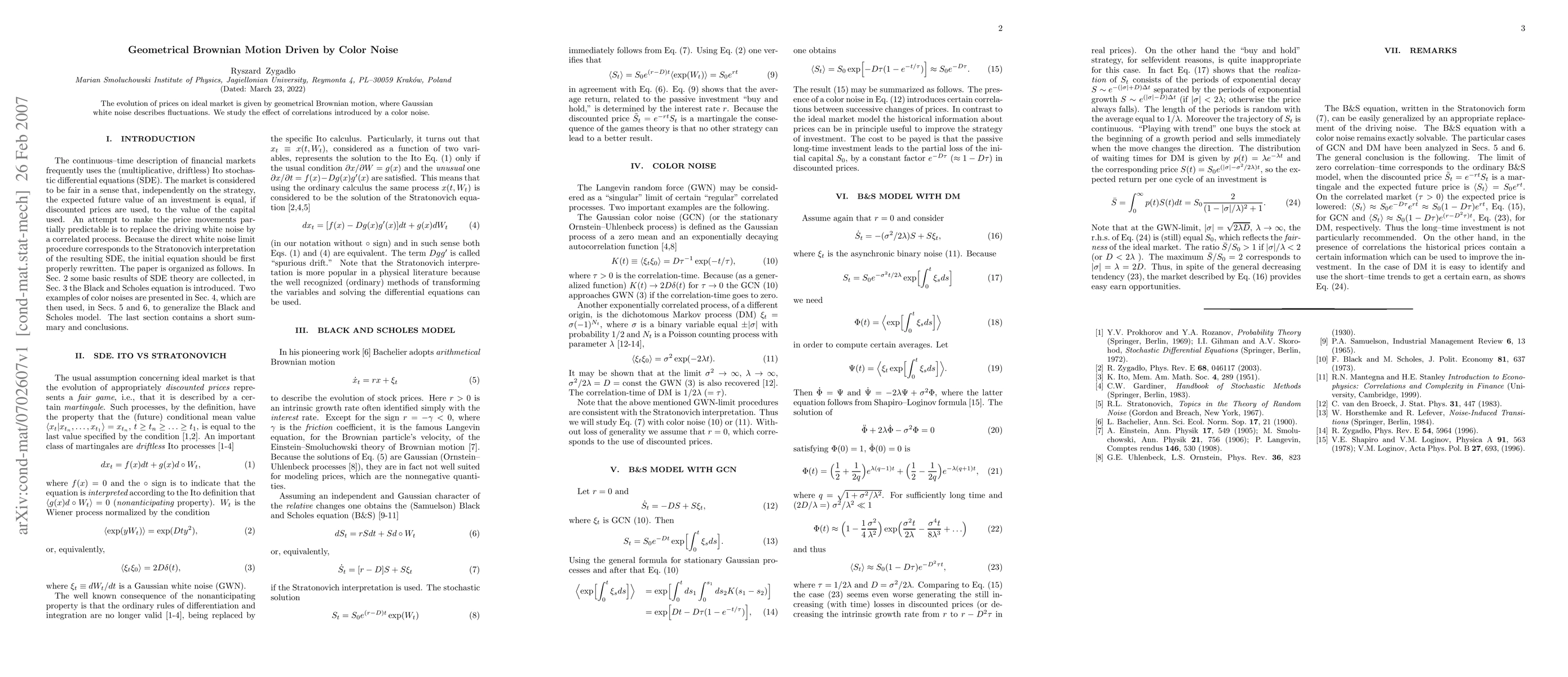 Researchers studied how color noise affects geometrical Brownian motion in ideal markets, finding it introduces correlations that impact price evolution. This adds complexity to the traditional model of market fluctuations.