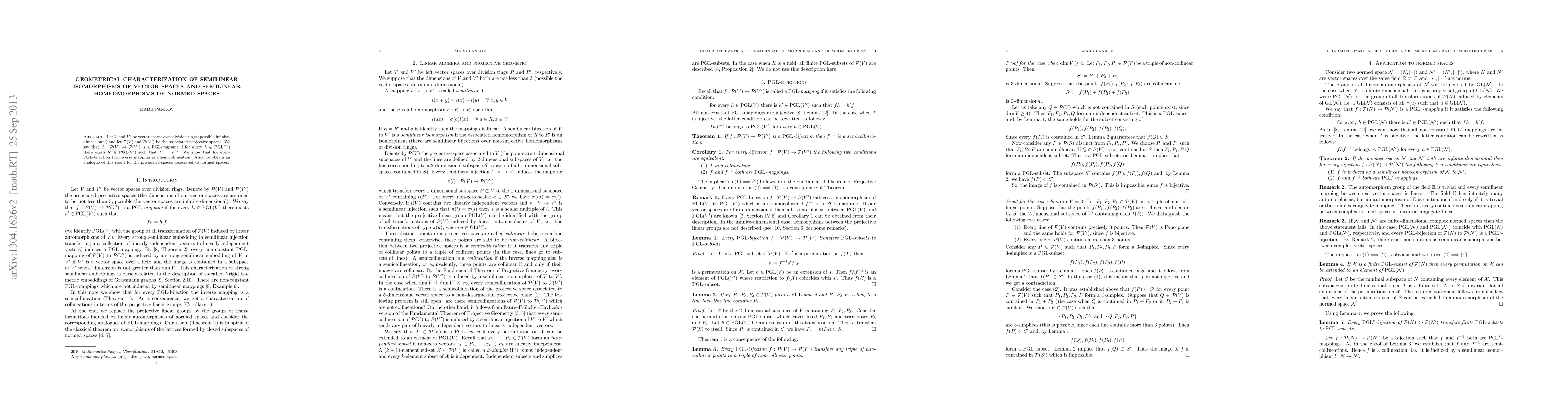 This paper studies semilinear isomorphisms of vector spaces and normed spaces, focusing on PGL-mappings and their properties, including the characterization of inverse mappings as semicollineations.