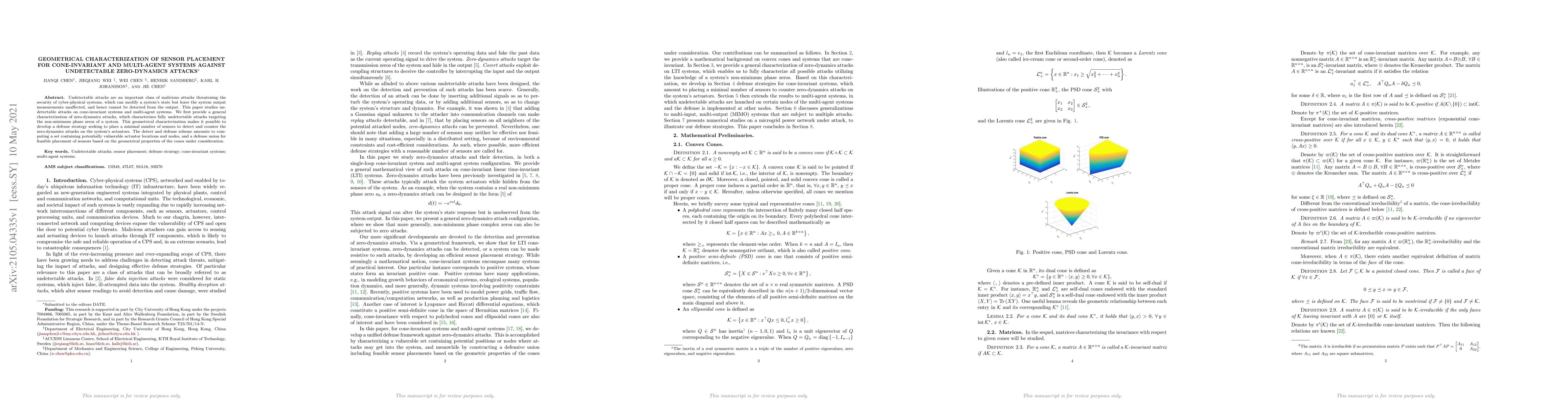 This paper characterizes undetectable zero-dynamics attacks on cone-invariant and multi-agent systems. It develops a geometrical defense strategy to optimally place sensors to detect and counter these attacks by identifying vulnerable actuator locations and feasible sensor placements.