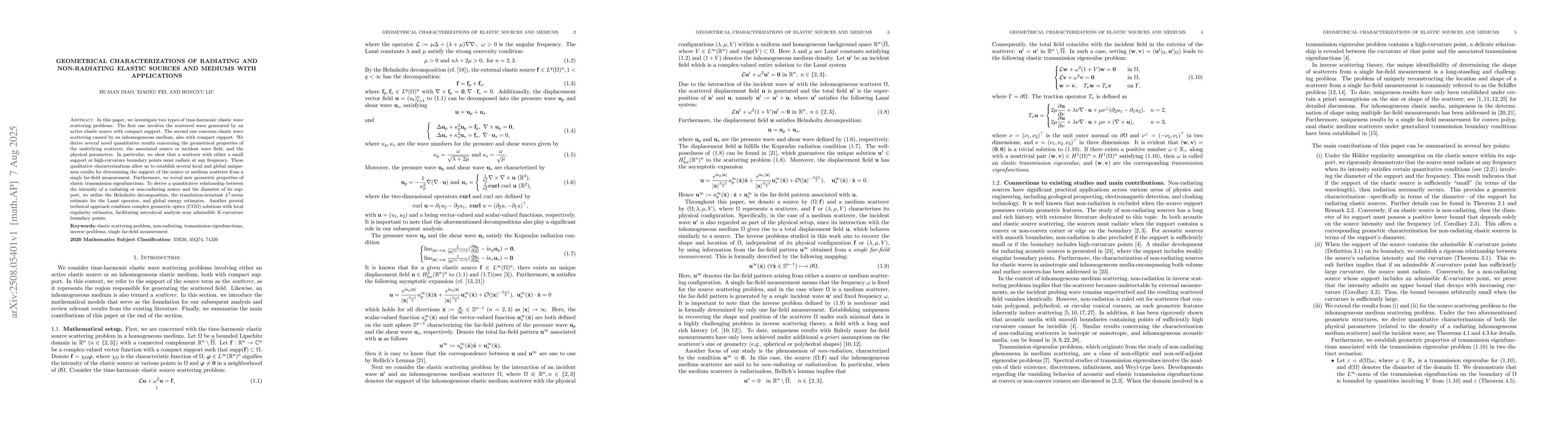 In this paper, we investigate two types of time-harmonic elastic wave scattering problems. The first one involves the scattered wave generated by an active elastic source with compact support. The second one concerns elastic wave scattering caused by an inhomogeneous medium, also with compact support. We derive several novel quantitative results concerning the geometrical properties of the underlying scatterer, the associated source or incident wave field, and the physical parameters. In particular, we show that a scatterer with either a small support or high-curvature boundary points must radiate at any frequency. These qualitative characterizations allow us to establish several local and global uniqueness results for determining the support of the source or medium scatterer from a single far-field measurement. Furthermore, we reveal new geometric properties of elastic transmission eigenfunctions. To derive a quantitative relationship between the intensity of a radiating or non-radiating source and the diameter of its support, we utilize the Helmholtz decomposition, the translation-invariant $L^2$-norm estimate for the Lam\'e operator, and global energy estimates. Another pivotal technical approach combines complex geometric optics (CGO) solutions with local regularity estimates, facilitating microlocal analysis near admissible $K$-curvature boundary points.