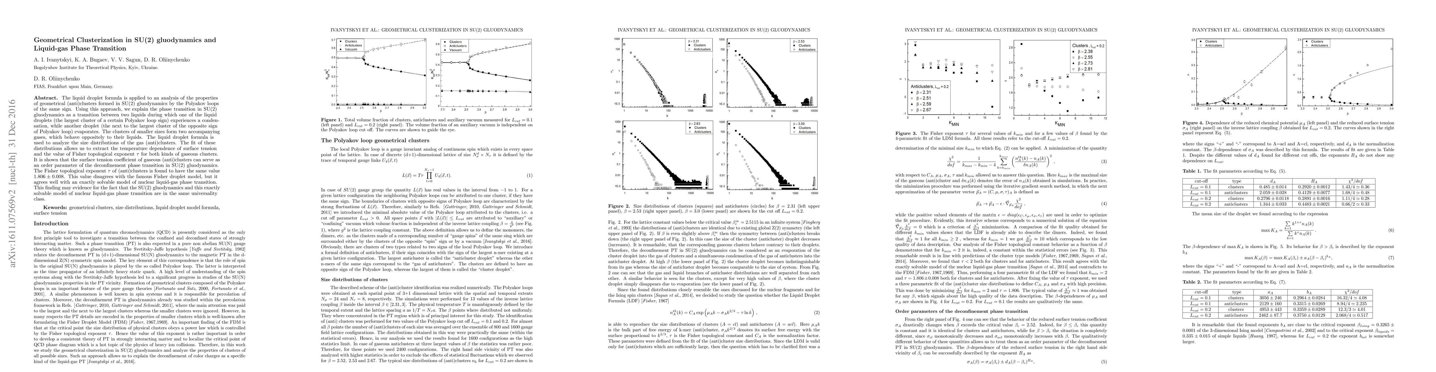 This paper applies the liquid droplet formula to analyze geometrical clusters in SU(2) gluodynamics, explaining the phase transition as a liquid-gas transition where the largest cluster condenses while the next largest evaporates. The study finds that the surface tension coefficient of gaseous clusters serves as an order parameter for the deconfinement phase transition, and the Fisher topological exponent $\tau$ is consistent with an exactly solvable nuclear liquid-gas model, suggesting SU(2) gluodynamics shares the same universality class.