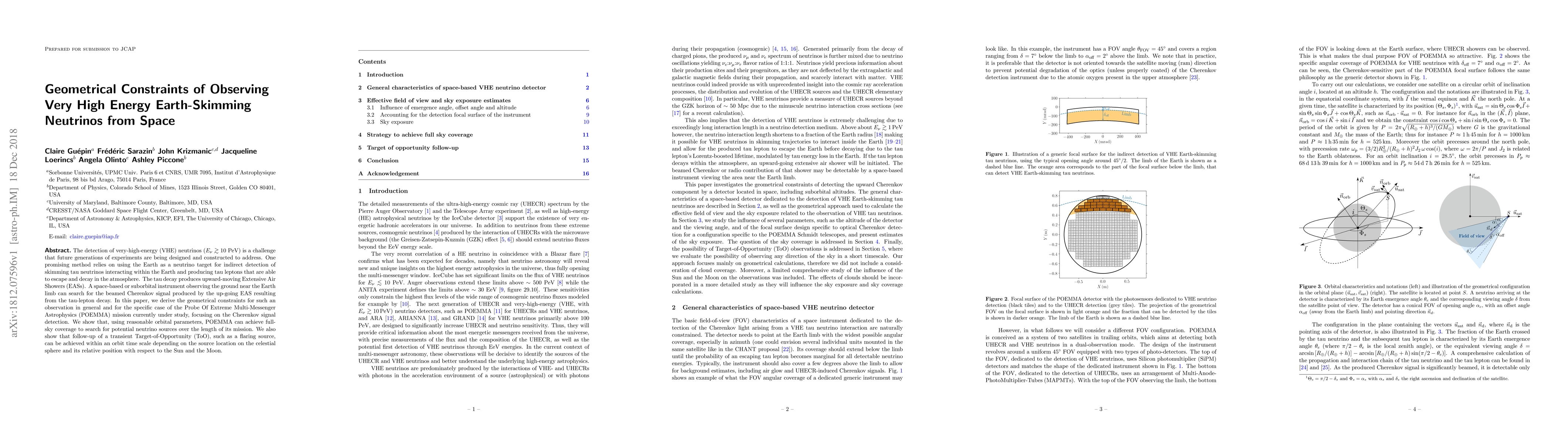The detection of very-high-energy (VHE) neutrinos ($E_\nu \gtrsim 10$ PeV) is a challenge that future generations of experiments are being designed and constructed to address. One promising method relies on using the Earth as a neutrino target for indirect detection of skimming tau neutrinos interacting within the Earth and producing tau leptons that are able to escape and decay in the atmosphere. The tau decay produces upward-moving Extensive Air Showers (EASs). A space-based or suborbital instrument observing the ground near the Earth limb can search for the beamed Cherenkov signal produced by the up-going EAS resulting from the tau-lepton decay. In this paper, we derive the geometrical constraints for such an observation in general and for the specific case of the Probe Of Extreme Multi-Messenger Astrophysics (POEMMA) mission currently under study, focusing on the Cherenkov signal detection. We show that, using reasonable orbital parameters, POEMMA can achieve full-sky coverage to search for potential neutrino sources over the length of its mission. We also show that follow-up of a transient Target-of-Opportunity (ToO), such as a flaring source, can be achieved within an orbit time scale depending on the source location on the celestial sphere and its relative position with respect to the Sun and the Moon.
