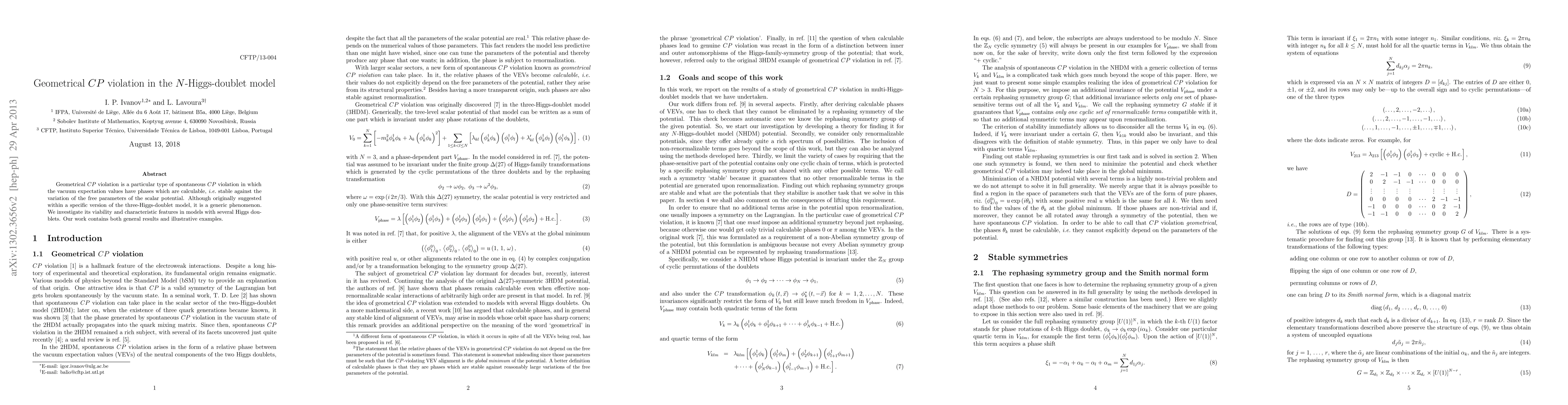 This paper explores geometrical CP violation in N-Higgs-doublet models, demonstrating its viability and characteristic features through both general theoretical results and specific examples. The study highlights the stability of phases in vacuum expectation values against variations in the scalar potential.