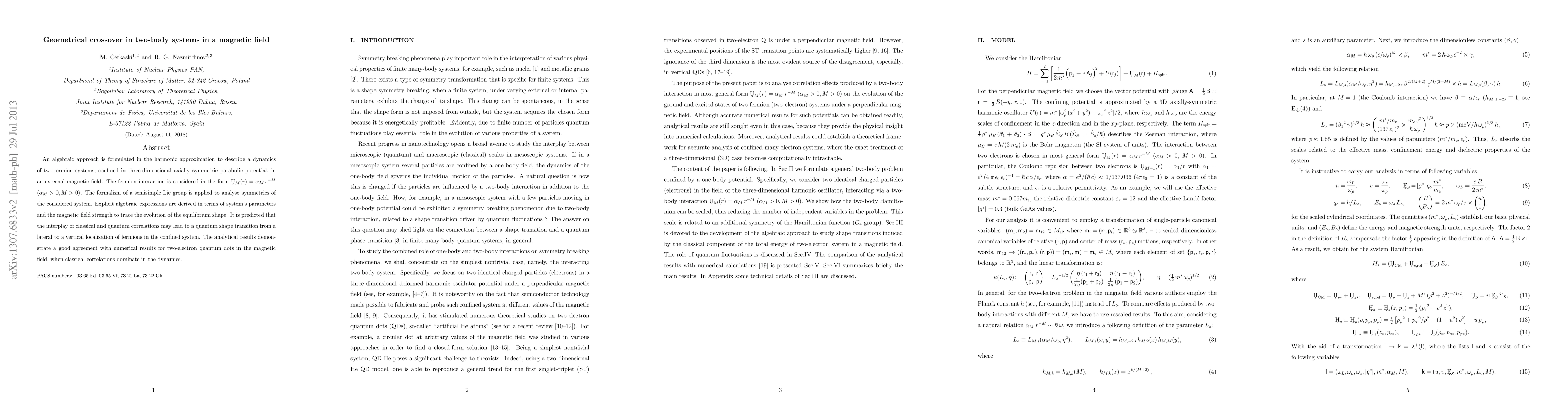 This paper formulates an algebraic approach to study the dynamics of two-fermion systems in a magnetic field using a harmonic approximation. It predicts a quantum shape transition from lateral to vertical localization due to the interplay of classical and quantum correlations, with results corroborated by numerical simulations for two-electron quantum dots.