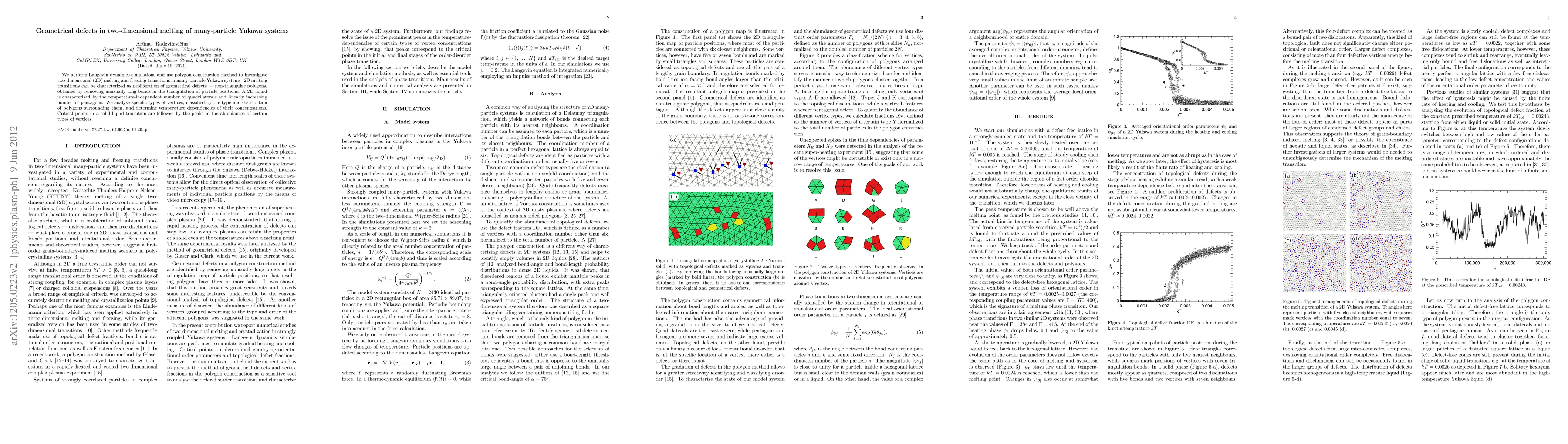 This study uses Langevin dynamics simulations and polygon construction to explore the melting and freezing transitions in two-dimensional many-particle Yukawa systems, identifying geometrical defects as key indicators of the transition. The research reveals that a 2D liquid is marked by a stable number of quadrilaterals and a temperature-dependent increase in pentagons, with critical points in the transition correlating to peaks in specific vertex types.