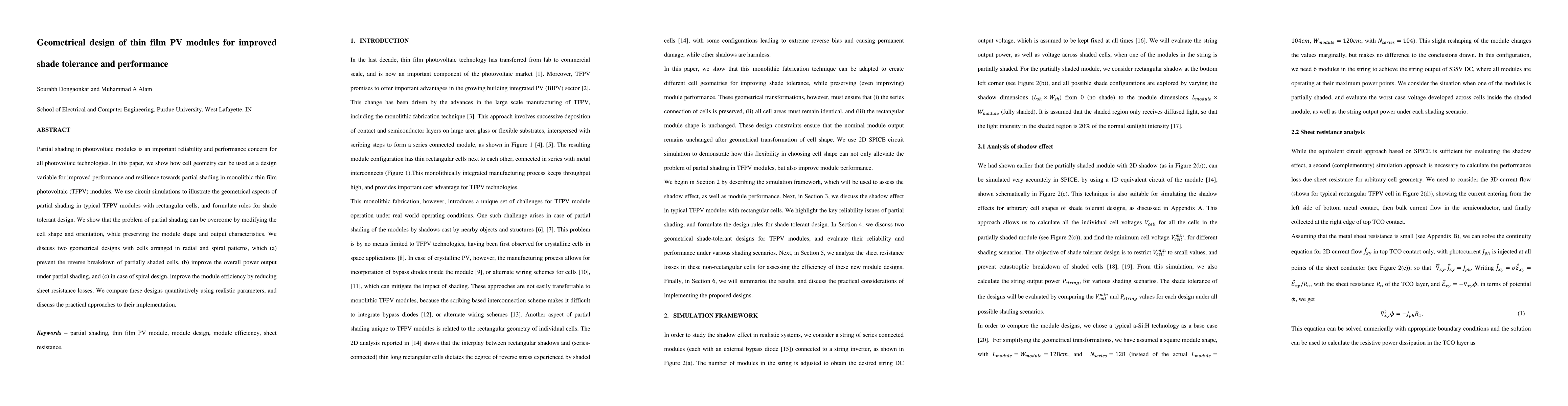 This research proposes using cell geometry modifications in thin-film solar panels to enhance performance under partial shading. It introduces radial and spiral cell arrangements that prevent shaded cell breakdown, boost overall power output, and increase module efficiency by reducing resistance losses. The paper uses circuit simulations and realistic parameters for comparison and discusses practical implementation approaches.