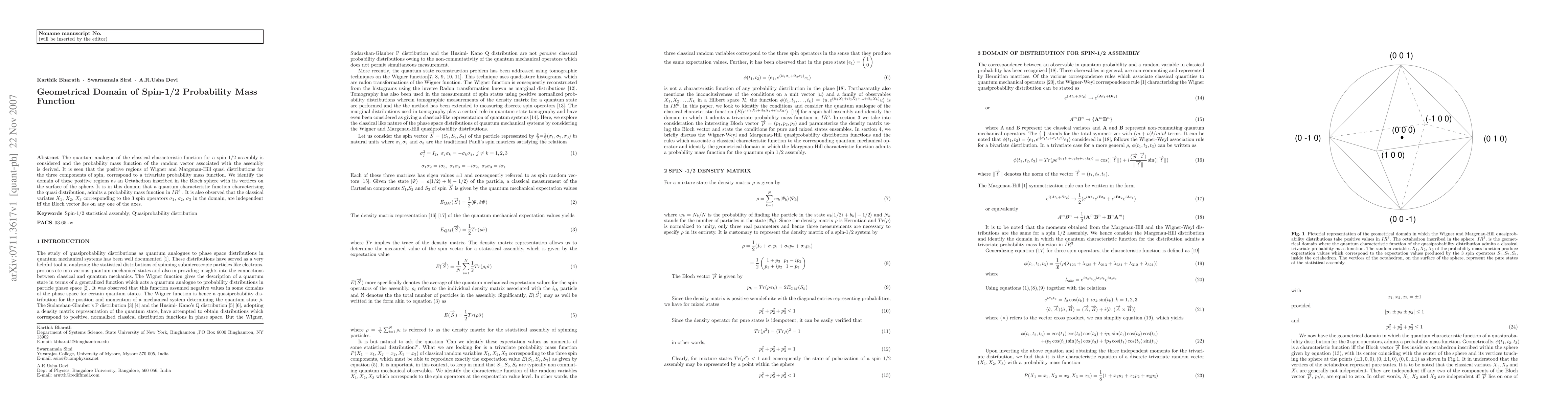 The quantum analogue of the classical characteristic function for a spin 1/2 assembly is considered and the probability mass function of the random vector associated with the assembly is derived. It is seen that the positive regions of Wigner and Margenau-Hill quasi distributions for the three components of spin, correspond to a trivariate probability mass function. We identify the domain of these positive regions as an Octahedron inscribed in the Bloch sphere with its vertices on the surface of the sphere. It is in this domain that a quantum characteristic function characterizing the quasi distribution, admits a probability mass function in IR^3 . It is also observed that the classical variates X1, X2, X3 corresponding to the 3 spin operators \sigma_1,\sigma_2,\sigma_3 in the domain, are independent iff the Bloch vector lies on any one of the axes.