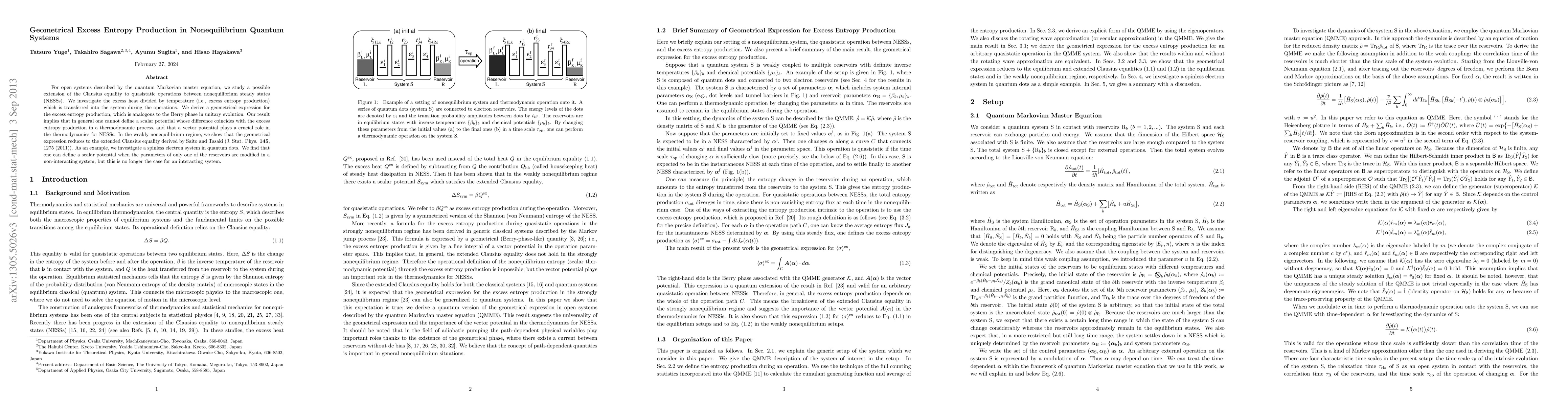 This paper extends the Clausius equality to quasistatic operations in nonequilibrium quantum systems, deriving a geometrical expression for excess entropy production analogous to the Berry phase. It reveals that a vector potential is essential for thermodynamic processes in nonequilibrium steady states, contrasting with scalar potentials in weakly nonequilibrium regimes.