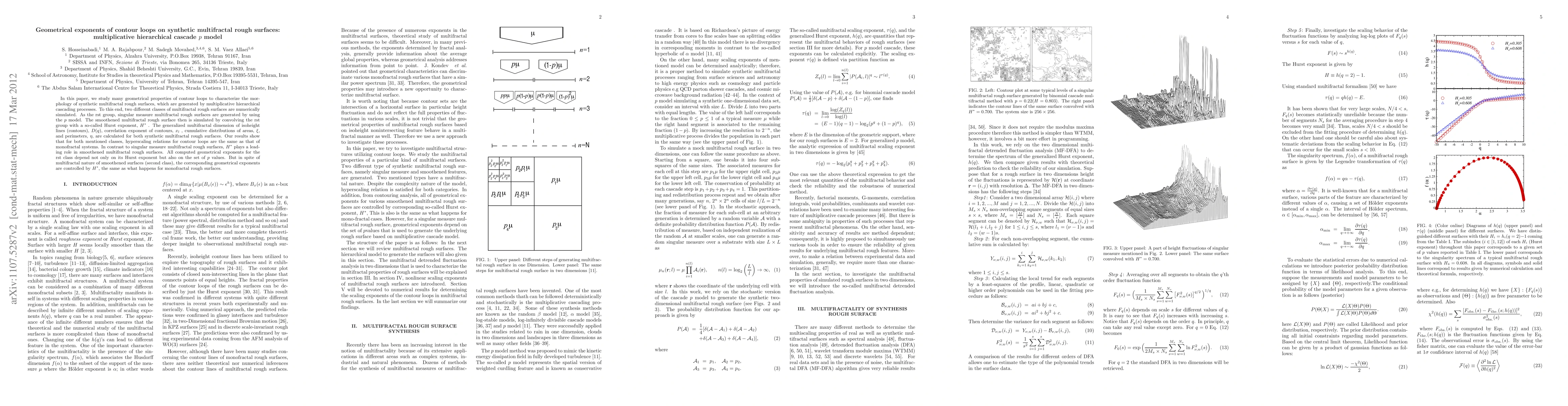 In this paper, we study many geometrical properties of contour loops to characterize the morphology of synthetic multifractal rough surfaces, which are generated by multiplicative hierarchical cascading processes. To this end, two different classes of multifractal rough surfaces are numerically simulated. As the first group, singular measure multifractal rough surfaces are generated by using the $p$ model. The smoothened multifractal rough surface then is simulated by convolving the first group with a so-called Hurst exponent, $H^*$ . The generalized multifractal dimension of isoheight lines (contours), $D(q)$, correlation exponent of contours, $x_l$, cumulative distributions of areas, $\xi$, and perimeters, $\eta$, are calculated for both synthetic multifractal rough surfaces. Our results show that for both mentioned classes, hyperscaling relations for contour loops are the same as that of monofractal systems. In contrast to singular measure multifractal rough surfaces, $H^*$ plays a leading role in smoothened multifractal rough surfaces. All computed geometrical exponents for the first class depend not only on its Hurst exponent but also on the set of $p$ values. But in spite of multifractal nature of smoothened surfaces (second class), the corresponding geometrical exponents are controlled by $H^*$, the same as what happens for monofractal rough surfaces.