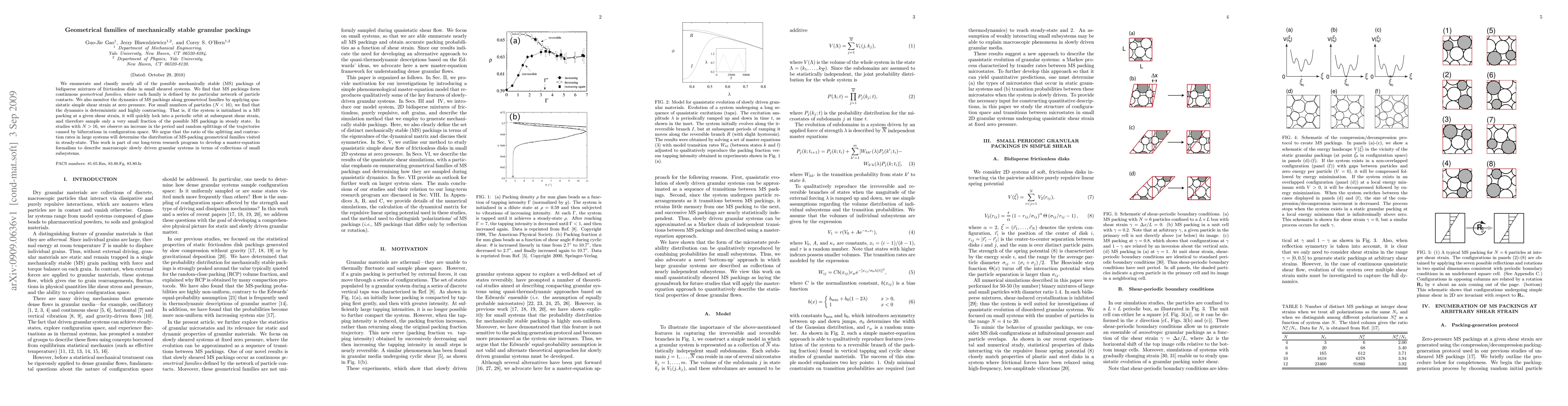 This paper classifies mechanically stable packings of frictionless disks in sheared systems, revealing that they form continuous geometrical families defined by particle contact networks. For small particle numbers, the dynamics are deterministic and contracting, while larger systems exhibit bifurcations and increased trajectory periods.