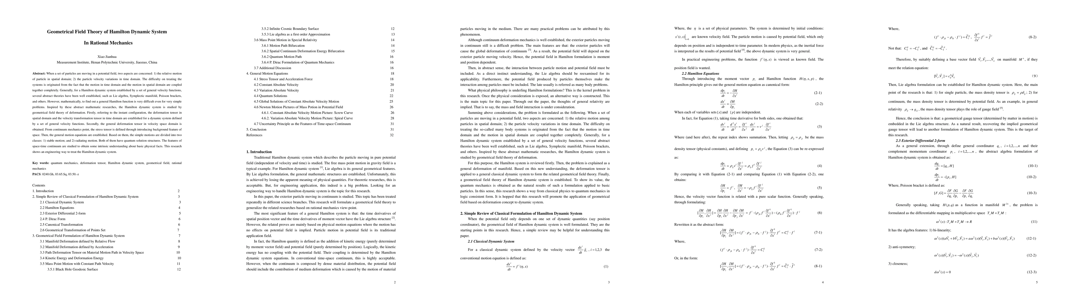 When a set of particles are moving in a potential field, two aspects are concerned: 1) the relative motion of particle in spatial domain; 2) the particle velocity variations in time domain. The difficulty on treating the systems is originated from the fact that the motion in time domain and the motion in spatial domain are coupled together completely. Generally, for a Hamilton dynamic system established by a set of general velocity functions, several abstract theories have been well established, such as Lie algebra, Symplectic manifold, Poisson brackets, and others. However, mathematically, to find out a general Hamilton function is very difficult even for very simple problems. Inspired by these abstract mathematic researches, the Hamilton dynamic system is studied by geometrical field theory of deformation. Firstly, referring to the instant configuration, the deformation tensor in spatial domain and the velocity transformation tensor in time domain are established for a dynamic system defined by a set of general velocity functions. Secondly, the general deformation tensor in velocity space domain is obtained. From continuum mechanics point, the stress tensor is defined through introducing background feature of space. Then, the general motion equations are established. Based on them, the simple motions are divided into two classes: 1) stable motion; and 2) radiating motion. Both of them have quantum solution structures. The features of space-time continuum are studied to obtain some intrinsic understanding about basic physical facts. This research shows an engineering way to treat the Hamilton dynamic system.