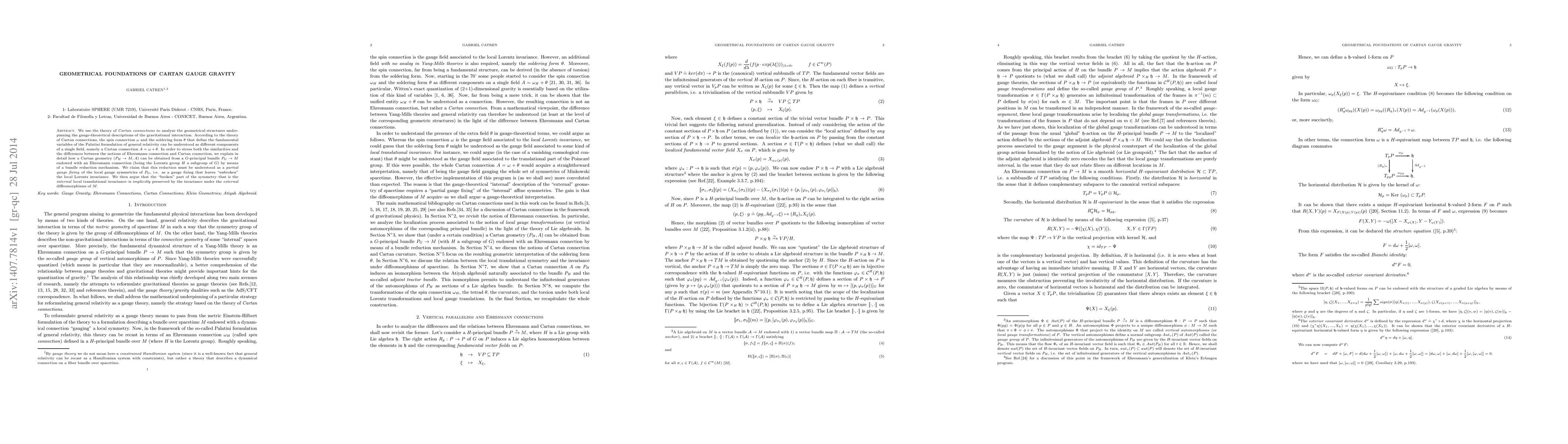 We use the theory of Cartan connections to analyze the geometrical structures underpinning the gauge-theoretical descriptions of the gravitational interaction. According to the theory of Cartan connections, the spin connection $\omega$ and the soldering form $\theta$ that define the fundamental variables of the Palatini formulation of general relativity can be understood as different components of a single field, namely a Cartan connection $A=\omega+\theta$. In order to stress both the similarities and the differences between the notions of Ehresmann connection and Cartan connection, we explain in detail how a Cartan geometry $(P_{H}\rightarrow M, A)$ can be obtained from a $G$-principal bundle $P_{G}\rightarrow M$ endowed with an Ehresmann connection (being the Lorentz group $H$ a subgroup of $G$) by means of a bundle reduction mechanism. We claim that this reduction must be understood as a partial gauge fixing of the local gauge symmetries of $P_{G}$, i.e. as a gauge fixing that leaves "unbroken" the local Lorentz invariance. We then argue that the "broken" part of the symmetry--that is the internal local translational invariance--is implicitly preserved by the invariance under the external diffeomorphisms of $M$.