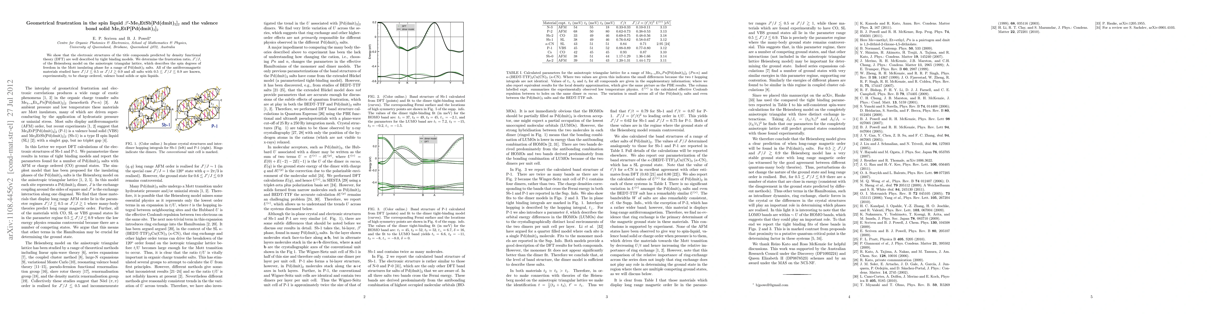 This paper investigates the electronic structures of two Pd(dmit)2 salts using density functional theory and tight binding models, finding that their spin degrees of freedom exhibit geometrical frustration. The study determines the frustration ratio J'/J, revealing that the materials conform to predictions for the Heisenberg model, with implications for understanding spin liquid and valence bond solid phases.