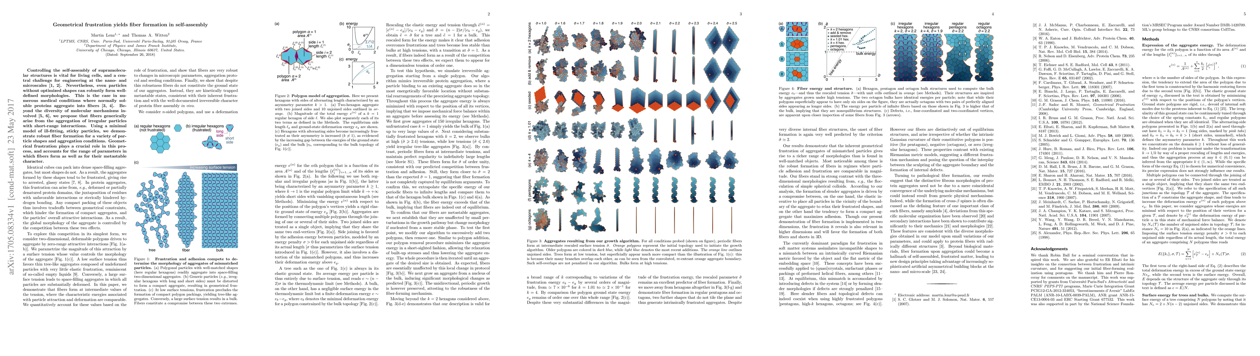 This paper demonstrates that geometrical frustration leads to the formation of fibers in the self-assembly of irregular particles with short-range interactions, regardless of particle shape. The study highlights the role of geometrical frustration in the formation and metastability of these fibers.