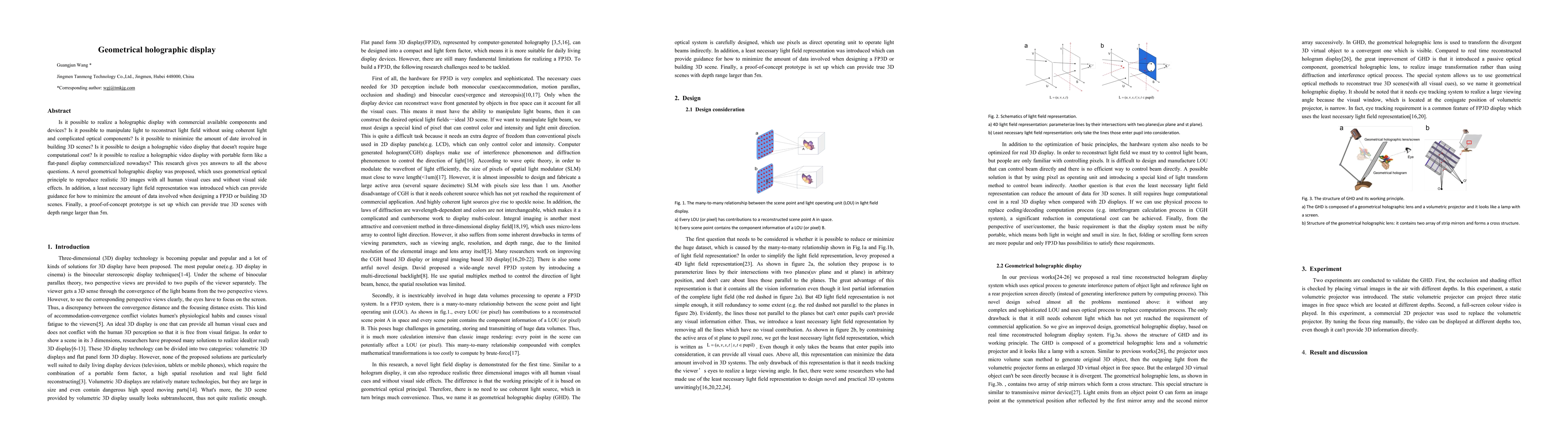 Is it possible to realize a holographic display with commercial available components and devices? Is it possible to manipulate light to reconstruct light field without using coherent light and complicated optical components? Is it possible to minimize the amount of date involved in building 3D scenes? Is it possible to design a holographic video display that doesn't require huge computational cost? Is it possible to realize a holographic video display with portable form like a flat-panel display commercialized nowadays? This research gives yes answers to all the above questions. A novel geometrical holographic display was proposed, which uses geometrical optical principle to reproduce realistic 3D images with all human visual cues and without visual side effects. In addition, a least necessary light field representation was introduced which can provide guidance for how to minimize the amount of data involved when designing a FP3D or building 3D scenes. Finally, a proof-of-concept prototype is set up which can provide true 3D scenes with depth range larger than 5m.