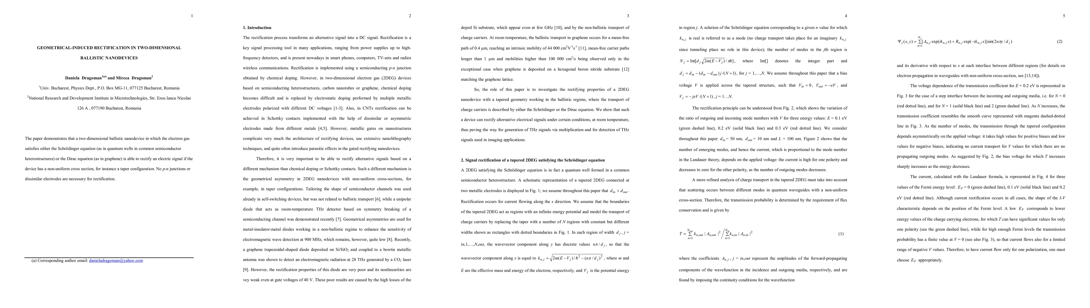 The paper demonstrates that a two-dimensional ballistic nanodevice in which the electron gas satisfies either the Schroodinger equation (as in quantum wells in common semiconductor heterostructures) or the Dirac equation (as in graphene) is able to rectify an electric signal if the device has a non-uniform cross section, for instance a taper configuration. No p-n junctions or dissimilar electrodes are necessary for rectification.