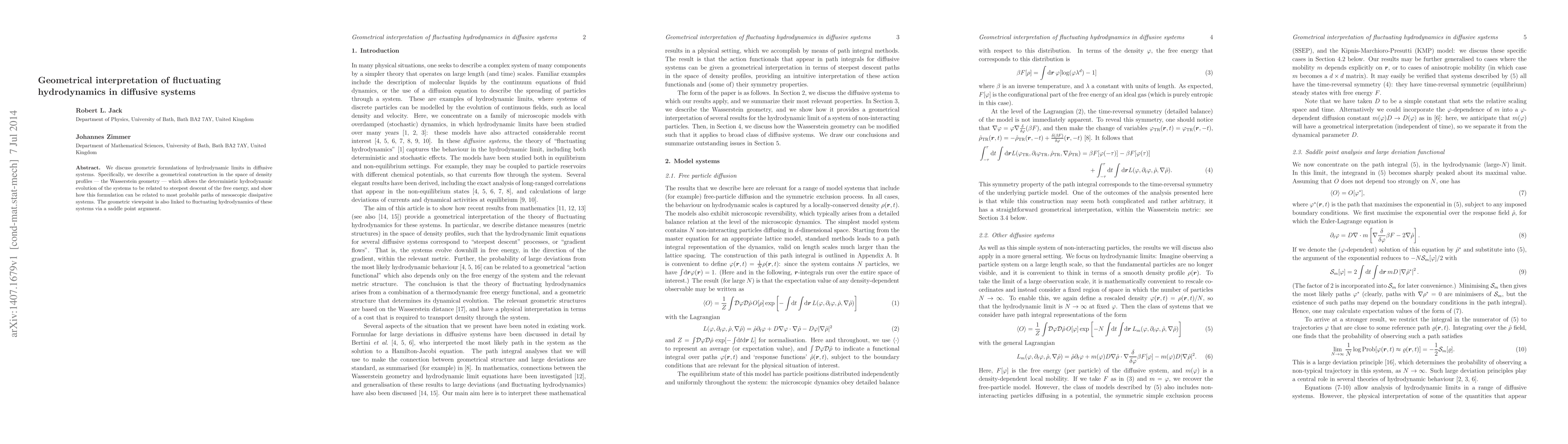 We discuss geometric formulations of hydrodynamic limits in diffusive systems. Specifically, we describe a geometrical construction in the space of density profiles --- the Wasserstein geometry --- which allows the deterministic hydrodynamic evolution of the systems to be related to steepest descent of the free energy, and show how this formulation can be related to most probable paths of mesoscopic dissipative systems. The geometric viewpoint is also linked to fluctuating hydrodynamics of these systems via a saddle point argument.